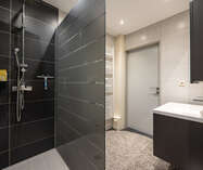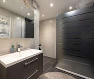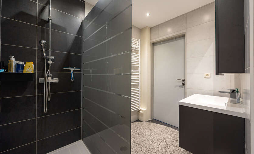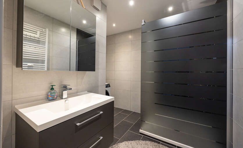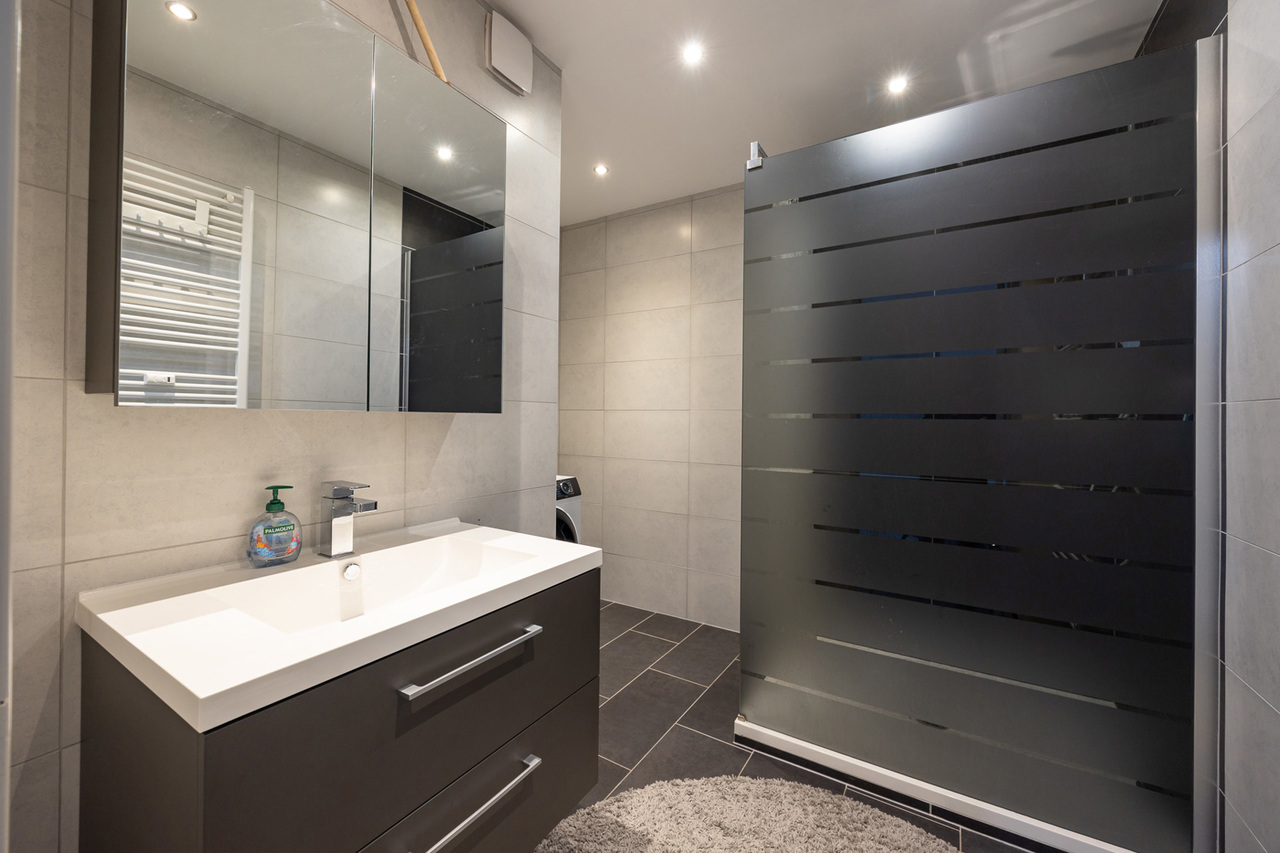 De badkamer werd ingericht met een regendouche, lavabo in meubel, handdoekdroger en aansluiting voor wasmachine.