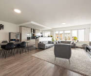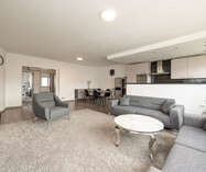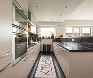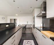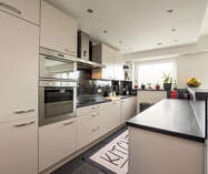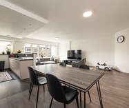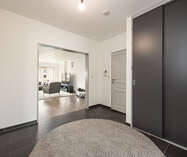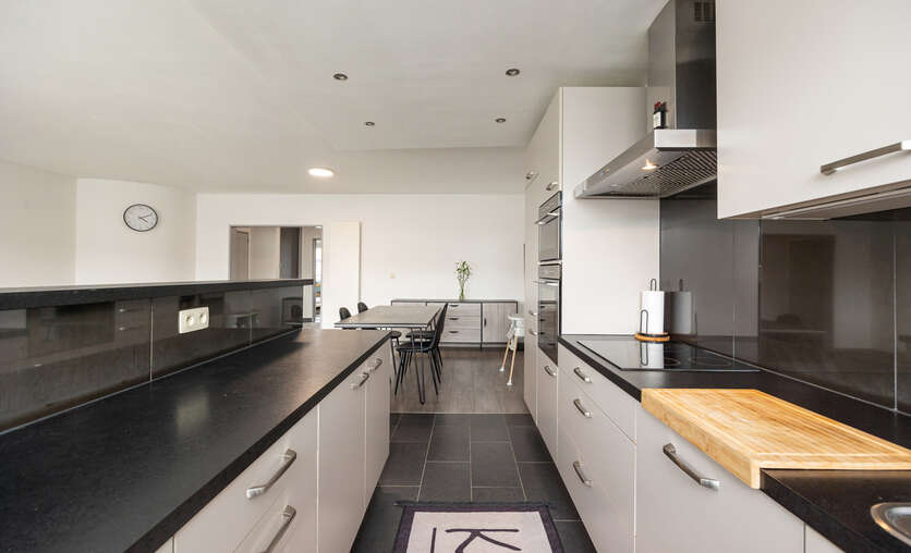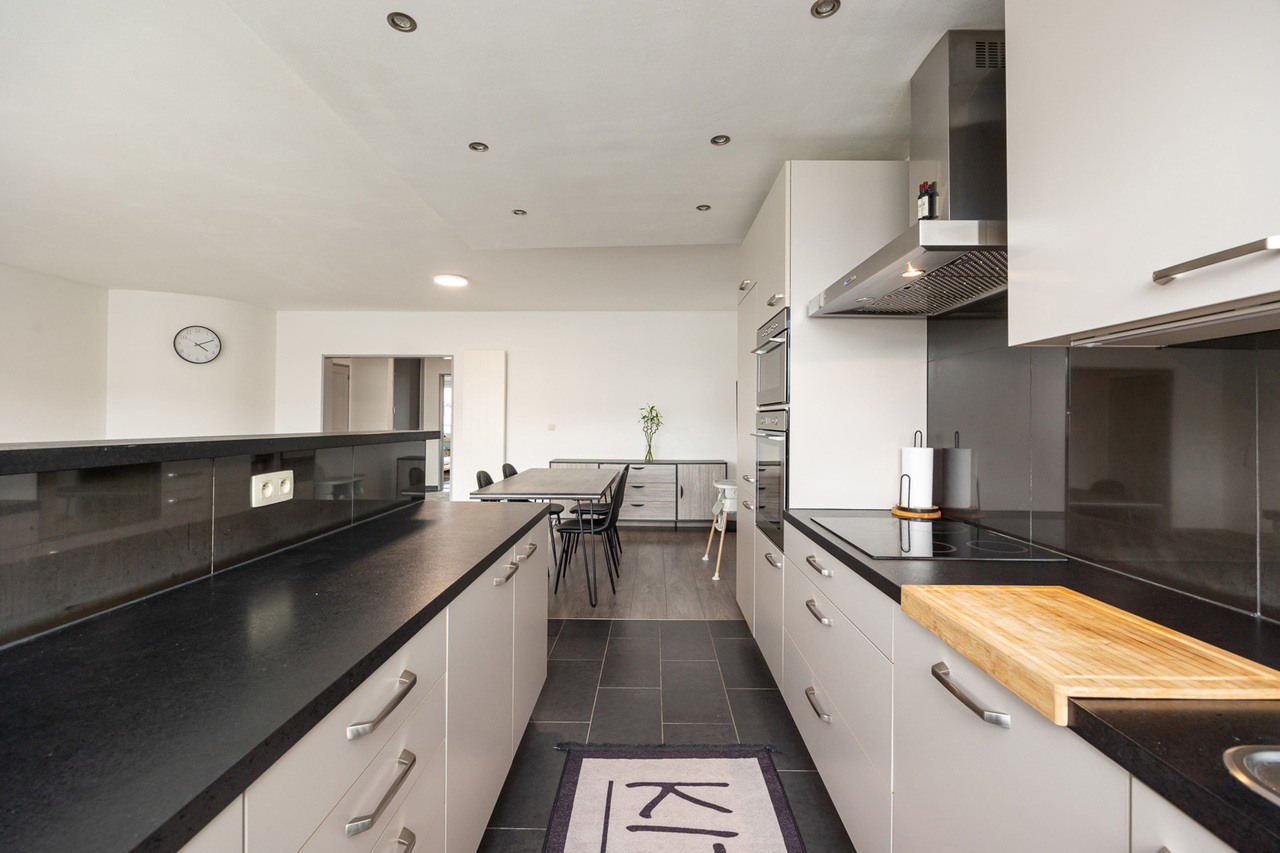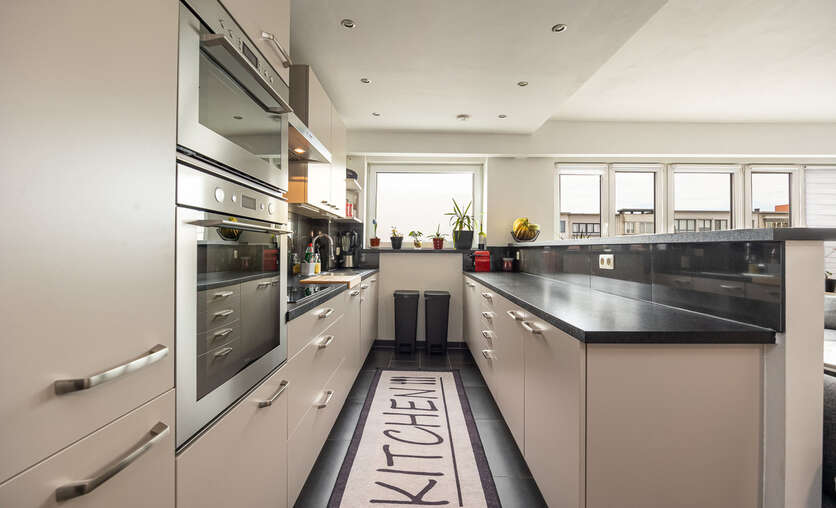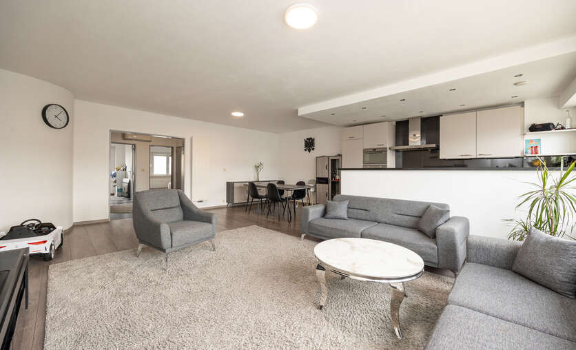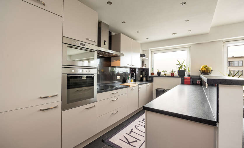 Bij binnenkomst geniet u van een ruime inkomhal met praktische vestiairekast en een gastentoilet met handenwasser. De inkom leidt naar de zeer ruime en lichtrijke woonkamer (47m²) op laminaatvloer, die aansluit op de open keuken. Deze is volledig uitgerust met een vaatwasser, spoelbak, koelkast met vriesvak, microgolfoven, heteluchtoven, vitrokeramische kookplaat en dampkap.