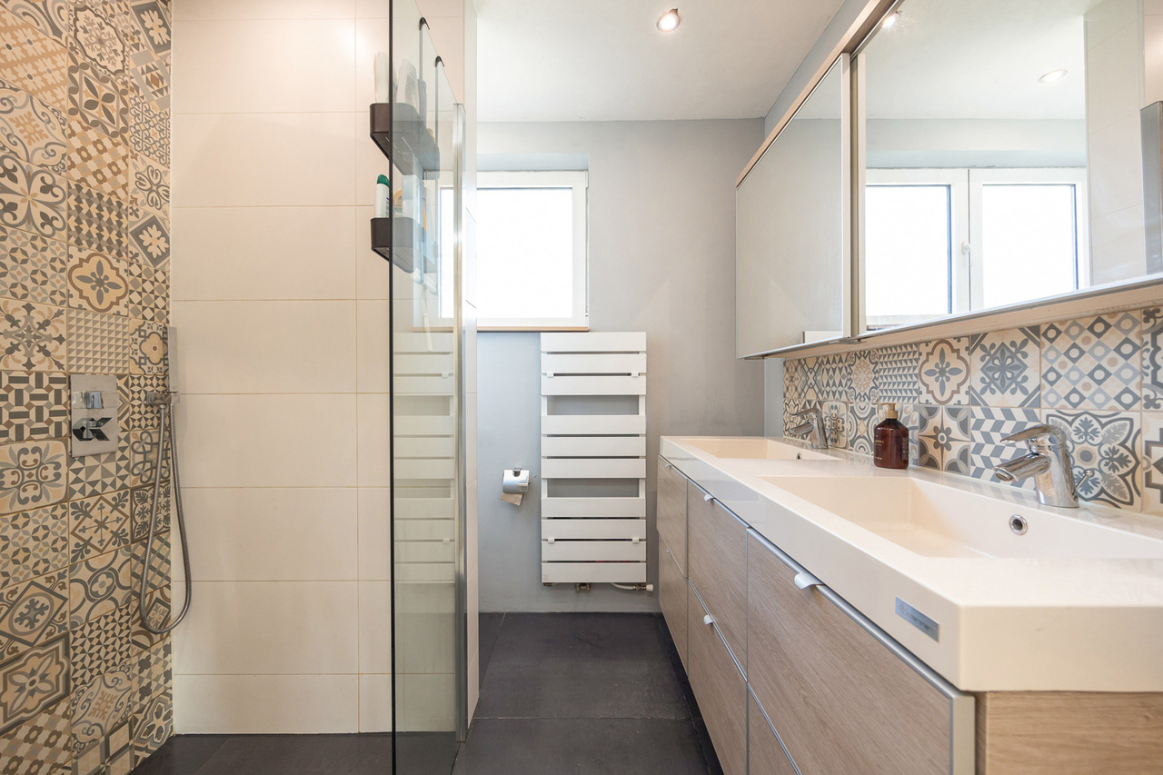 Op de verdieping brengt de nachthal op laminaat je naar vier slaapkamers (14,94m², 13,53m², 11,37m² en 13,17m²), waarvan de masterbedroom beschikt over een aparte dressing en een zolderluik dat toegang geeft tot de ruime bergzolder (50m²). Ook de badkamer op deze verdieping is volledig uitgerust met een inloopdouche met regendouchekop, toilet en dubbele lavabo in meubel.