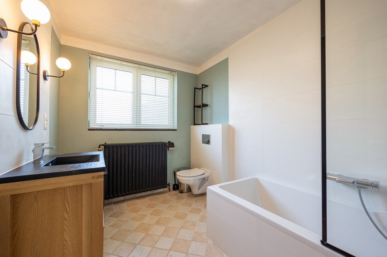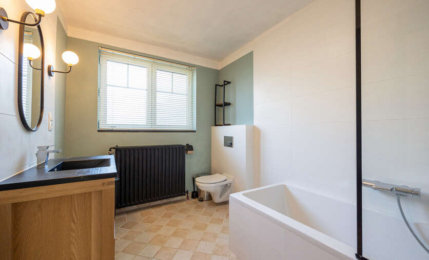 De badkamer, vernieuwd in 2023, is volledig uitgerust met ligbad, geïntegreerde douche, lavabo in meubel en toilet.