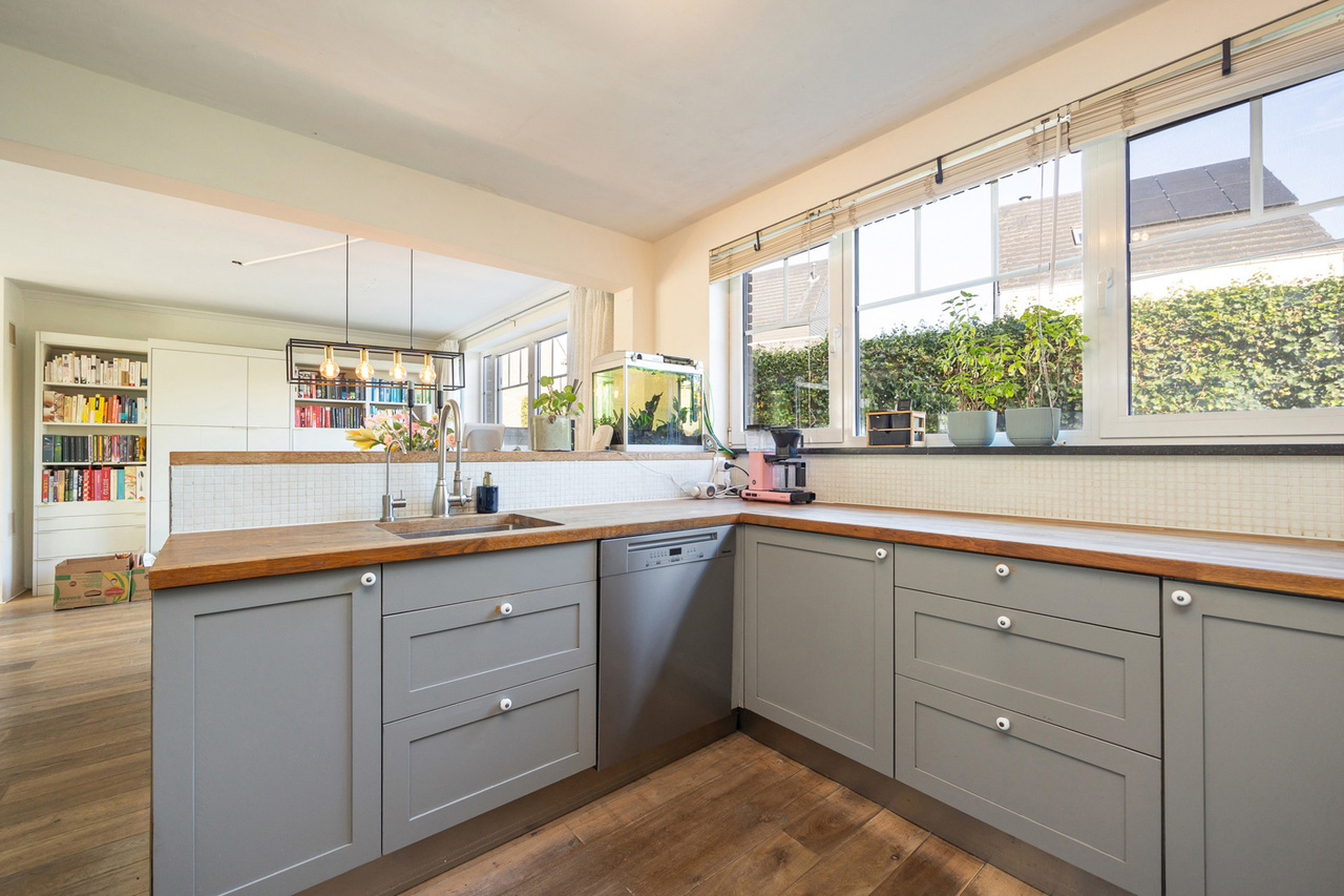 Inkomhal op parket, voorzien van een ingemaakte vestiairekast en een gastentoilet op marmeren vloer. Toegang tot de kelder. Aansluitend bevinden zich een berging en een wasplaats op leisteen met aparte zij-ingang. De gezellige woonkamer in L-vorm (42m²) op eiken parket is uitgerust met een sfeervolle gashaard. Dankzij de dubbele openslaande deuren geniet je hier van een vlotte verbinding naar het terras en de tuin. Open keuken (2013) voorzien van kwalitatieve toestellen, waaronder een SMEG koelkast met vriesvak, een Miele vaatwasser (2022), dampkap, dubbele spoelbak en microgolfoven.