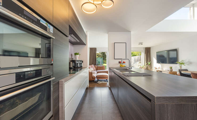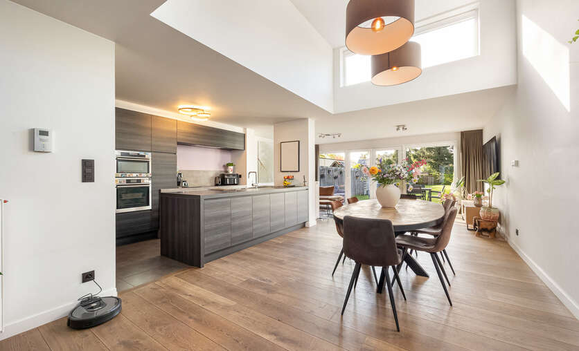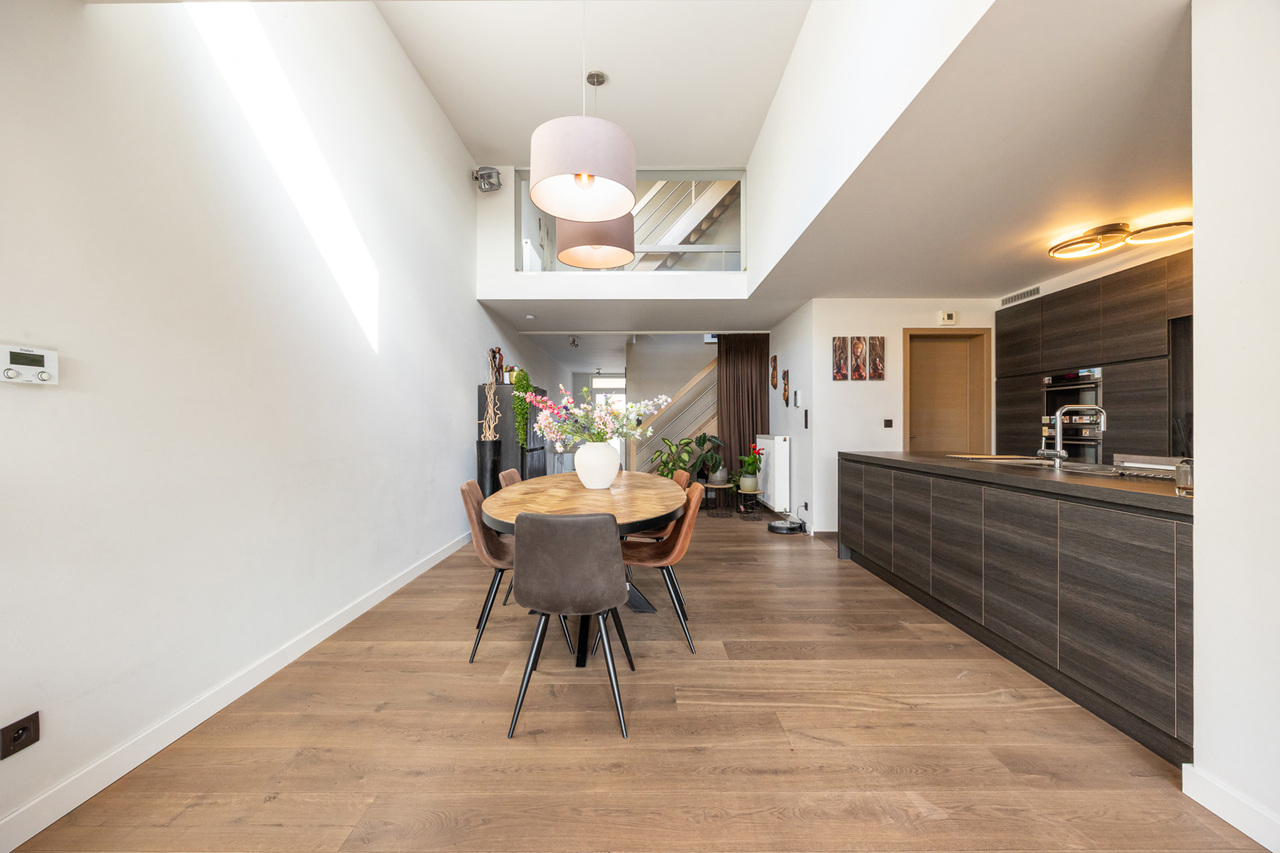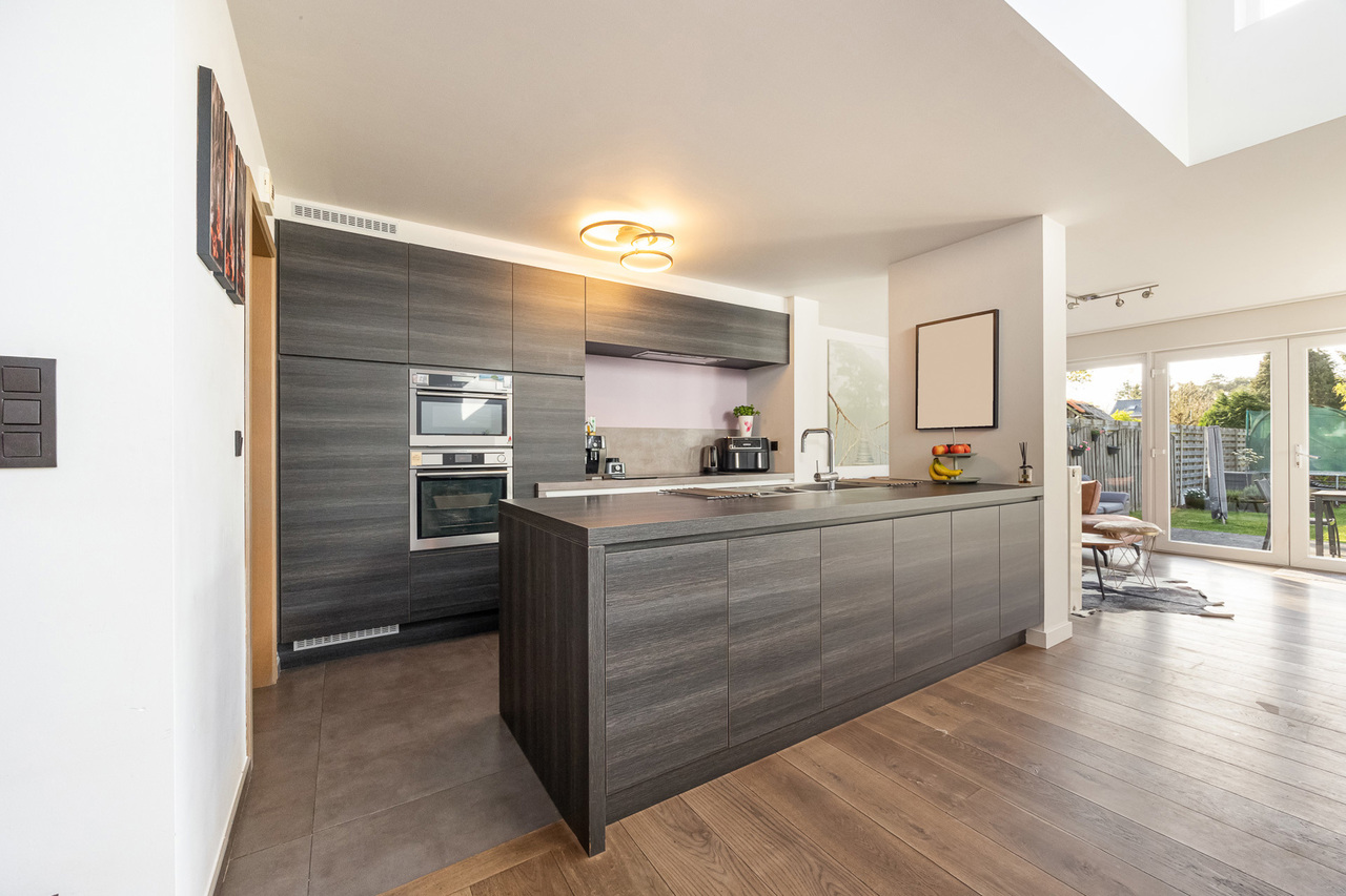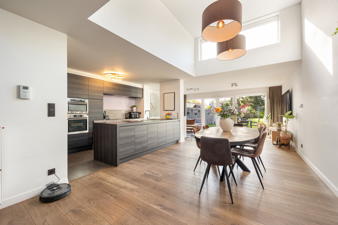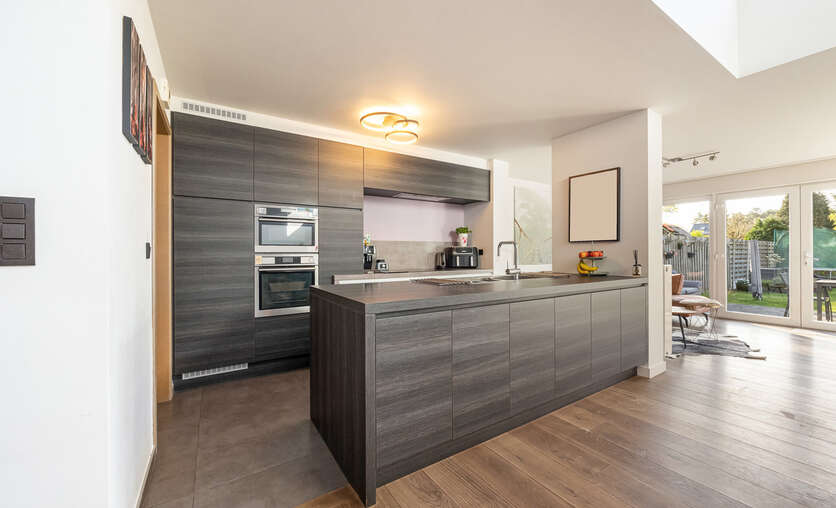 De lichtrijke leefruimte in L-vorm (50m²), afgewerkt met parket en een open vide boven de eetkamer, biedt een aangename woonbeleving. De volledig ingerichte keuken is uitgerust met een ruim werkeiland met dubbele spoelbak, inductiekookplaat, dampkap, twee combi-ovens (stoom/hetelucht en microgolf/hetelucht) en een koelkast. Naast de keuken bevindt zich een handige berging/wasplaats met directe toegang tot de garage.