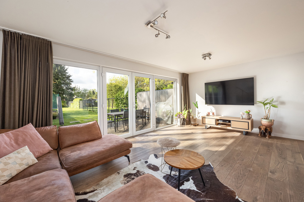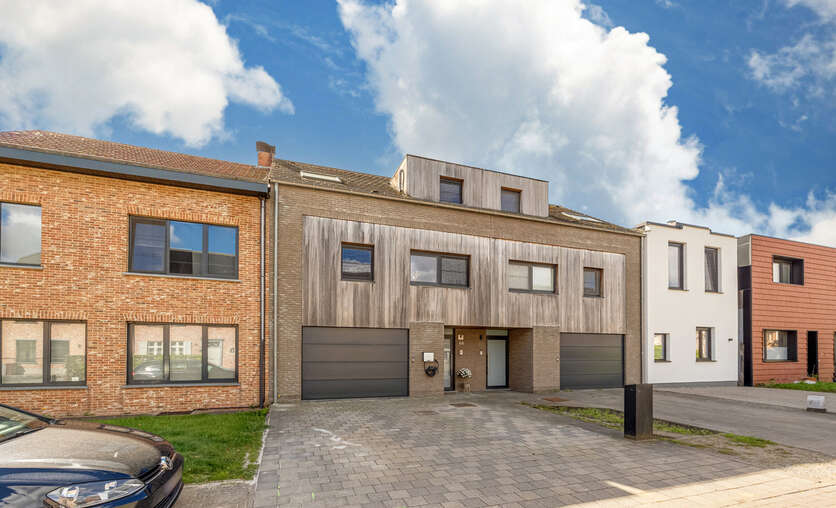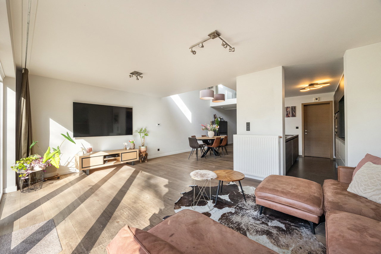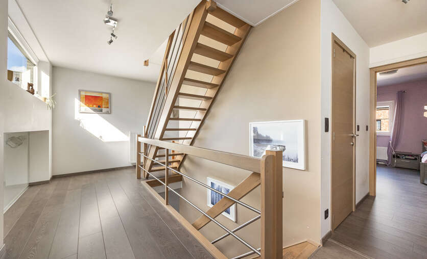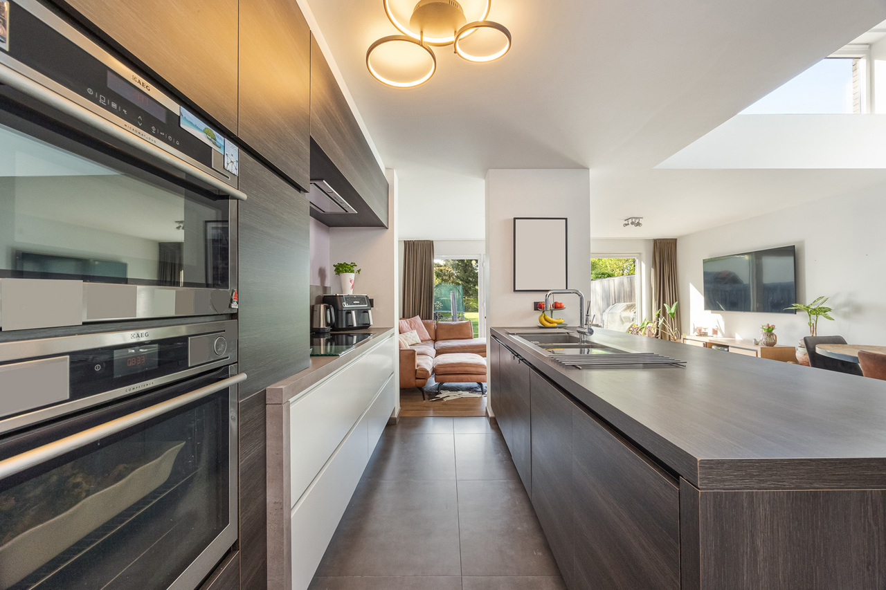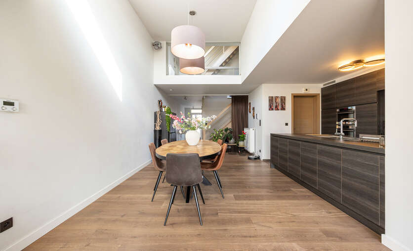 De lichtrijke leefruimte in L-vorm (50m²), afgewerkt met parket en een open vide boven de eetkamer, biedt een aangename woonbeleving. De volledig ingerichte keuken is uitgerust met een ruim werkeiland met dubbele spoelbak, inductiekookplaat, dampkap, twee combi-ovens (stoom/hetelucht en microgolf/hetelucht) en een koelkast. Naast de keuken bevindt zich een handige berging/wasplaats met directe toegang tot de garage.