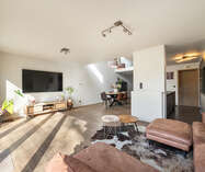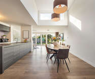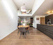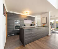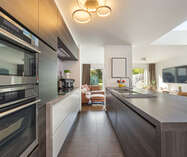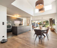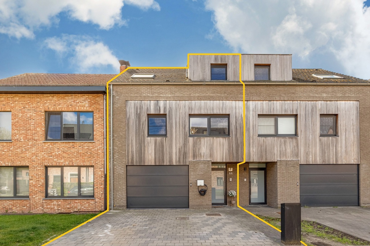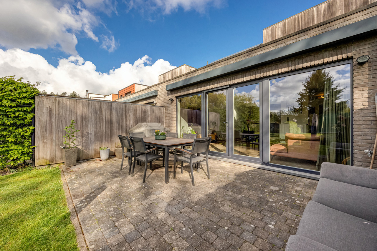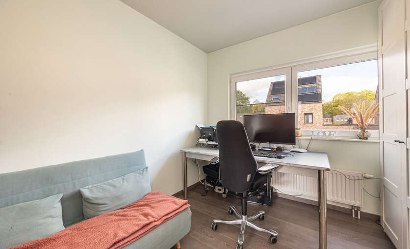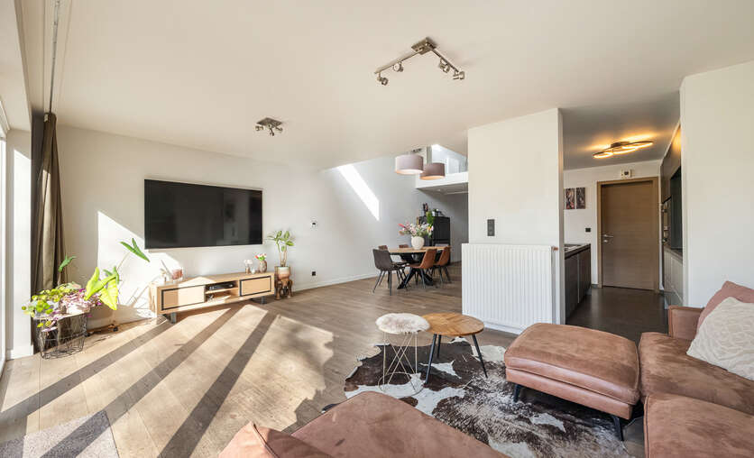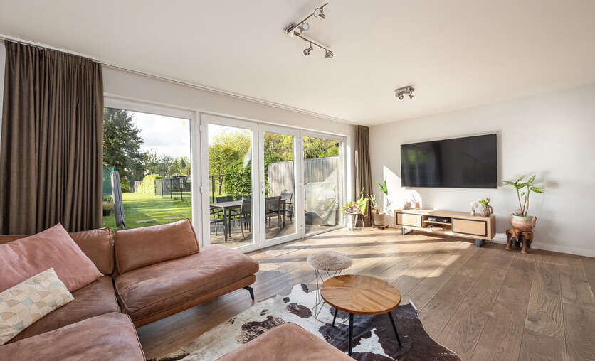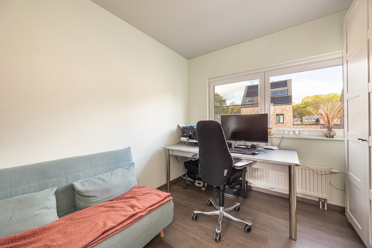 De lichtrijke leefruimte in L-vorm (50m²), afgewerkt met parket en een open vide boven de eetkamer, biedt een aangename woonbeleving. De volledig ingerichte keuken is uitgerust met een ruim werkeiland met dubbele spoelbak, inductiekookplaat, dampkap, twee combi-ovens (stoom/hetelucht en microgolf/hetelucht) en een koelkast. Naast de keuken bevindt zich een handige berging/wasplaats met directe toegang tot de garage.