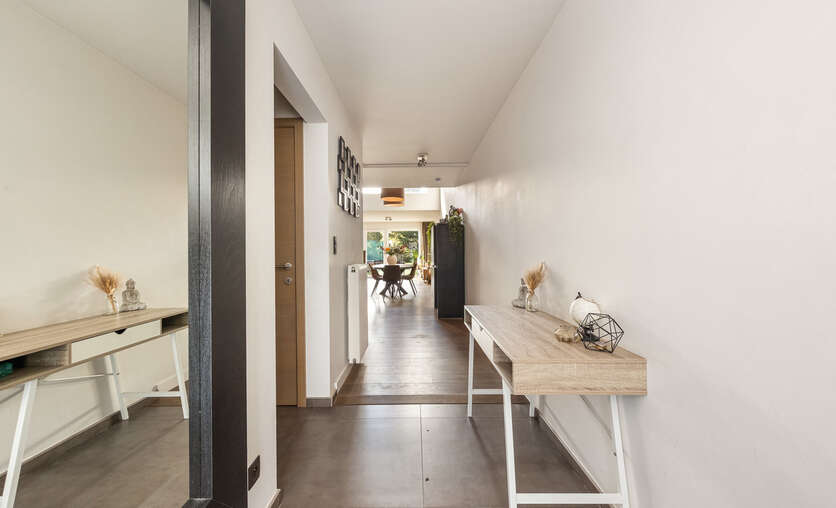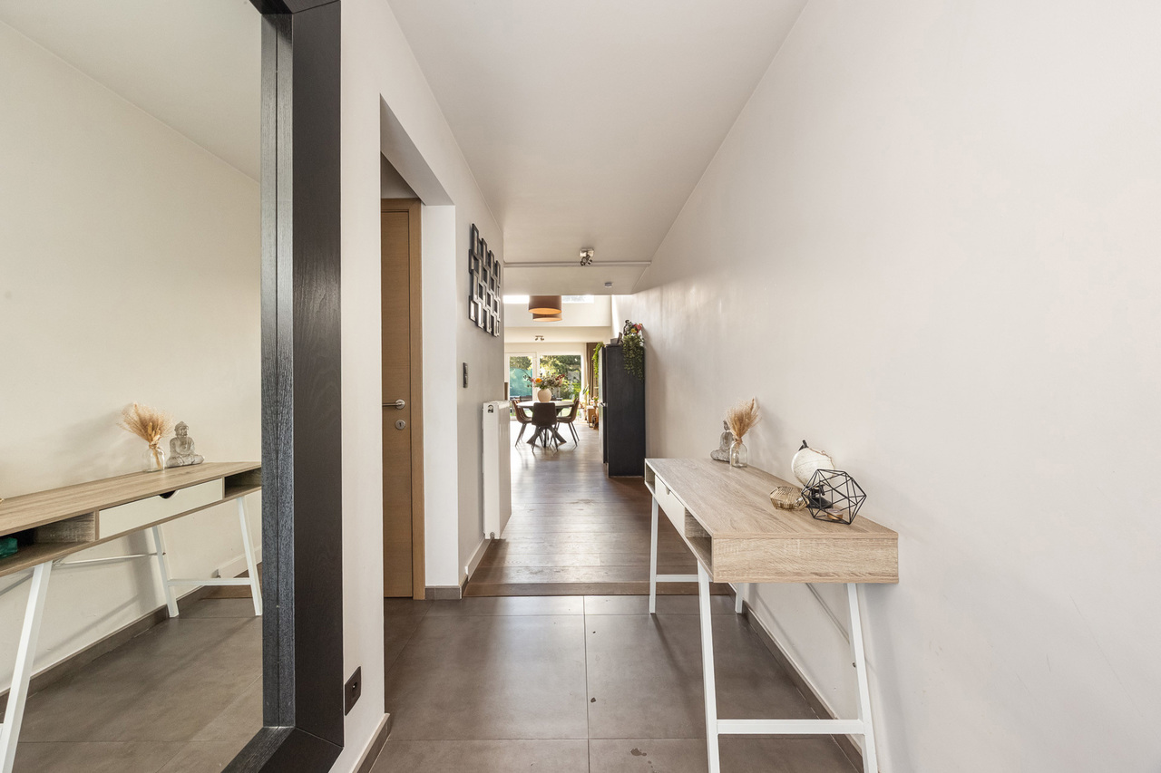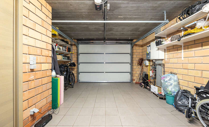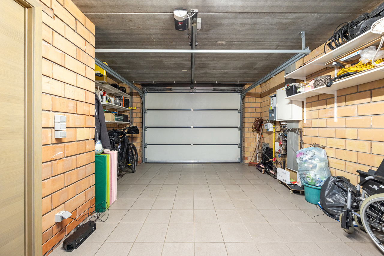 Bij het betreden van de woning komt u in een verzorgde inkomhal op tegelvloer, voorzien van een vestiaire en een gastentoilet. Aansluitend bevindt zich de garage met elektrische sectionale poort en praktische uitgietbak.