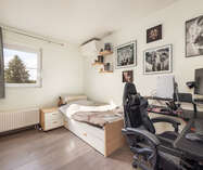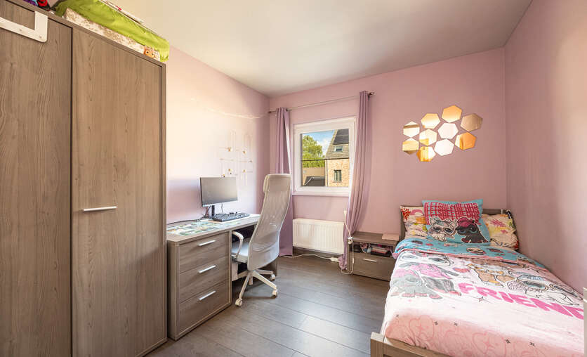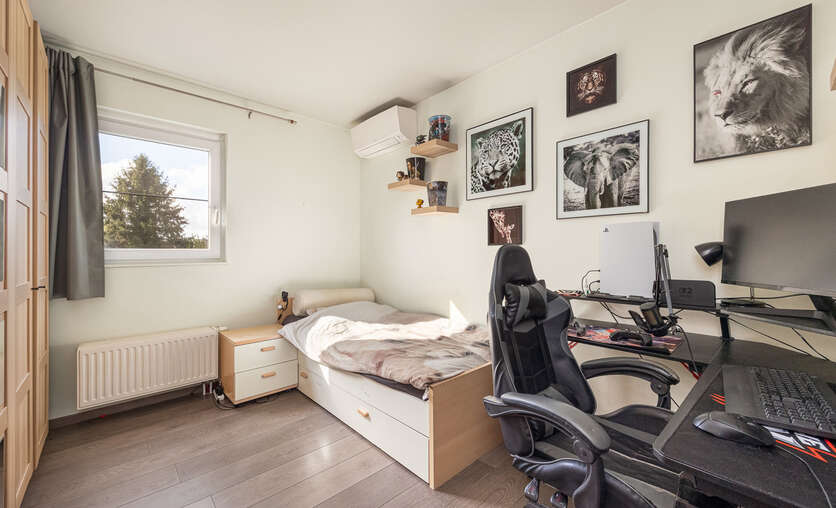 Op de eerste verdieping leidt de ruime nachthal naar drie slaapkamers (11,3m² / 11,5m² / 11,5m²) met laminaatvloer, een douchekamer en een apart toilet. Twee slaapkamers zijn bovendien voorzien van airconditioning.