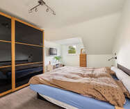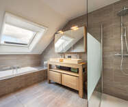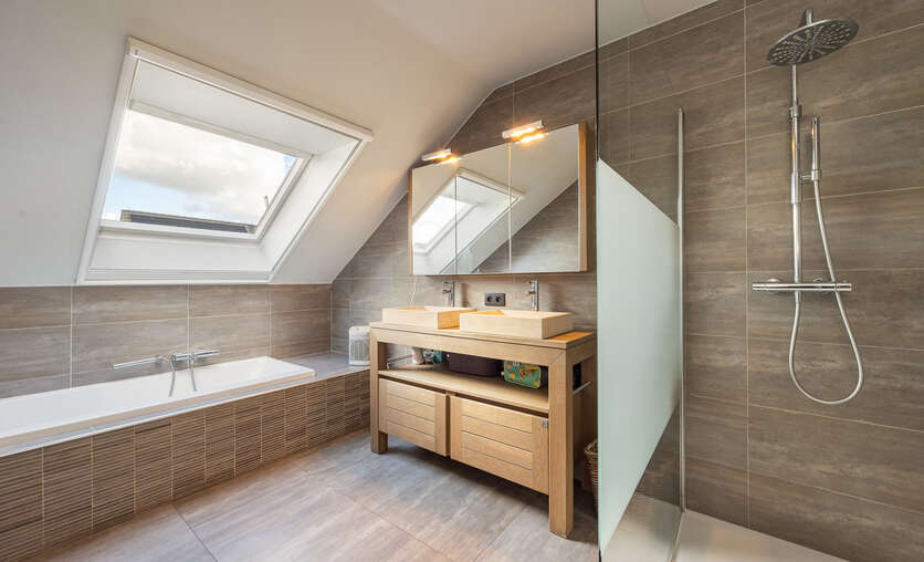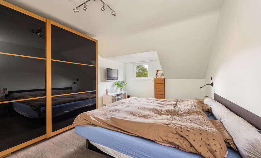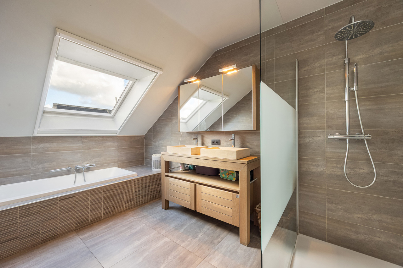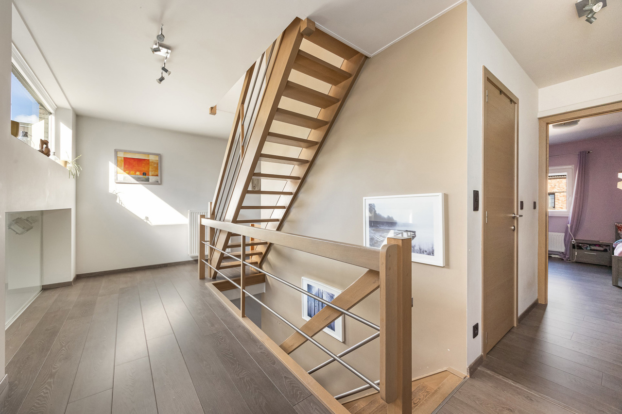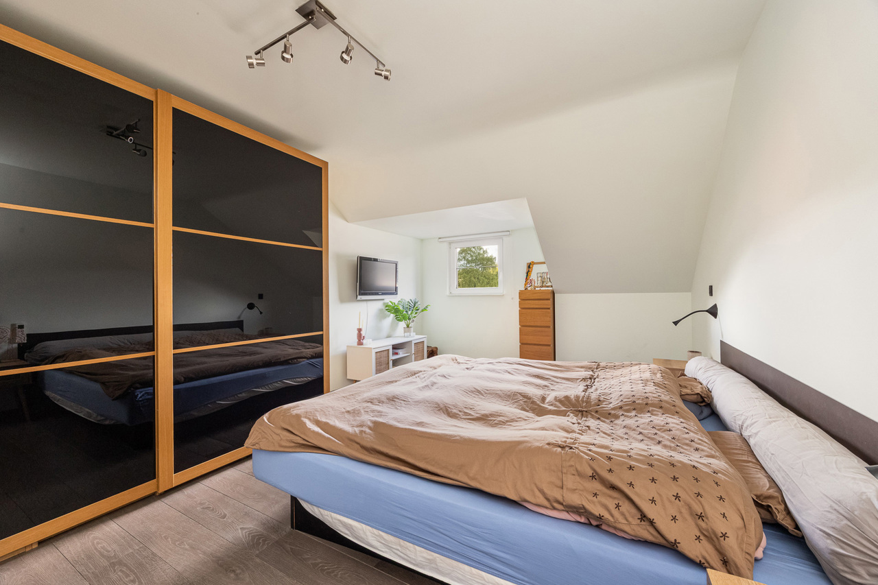 De dakverdieping herbergt de master-bedroom op laminaat (19,4m²), eveneens voorzien van airconditioning, een extra toilet, een berging en een badkamer met zowel een inloopdouche als een ligbad.
