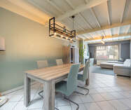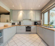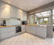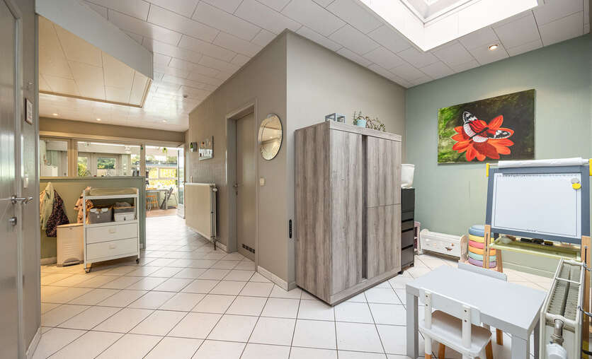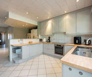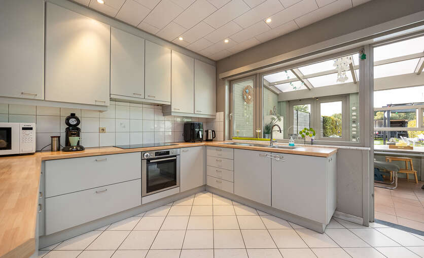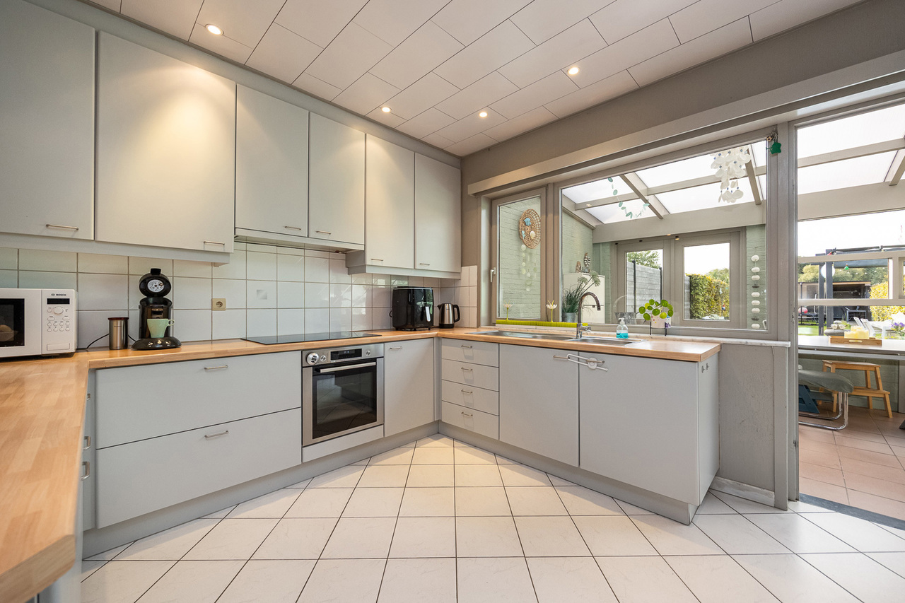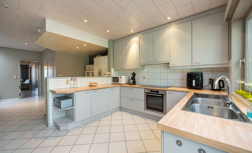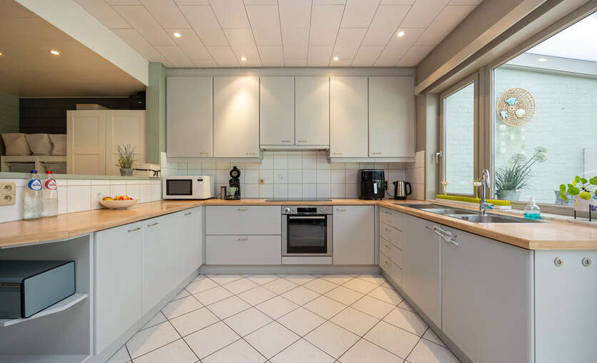 Aansluitend bevindt zich de zeer ruime leefkeuken ( 30m²), met een heteluchtoven, inductiekookplaat (2024), dampkap en dubbele spoelbak. Losstaande koelkast met vriezer en vaatwasser in de berging.