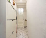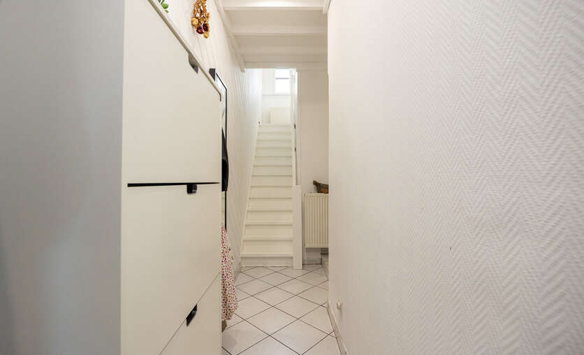 Inkomhal op tegelvloer die toegang biedt tot de lichte woonkamer (26 m²) met sierhaard.