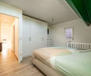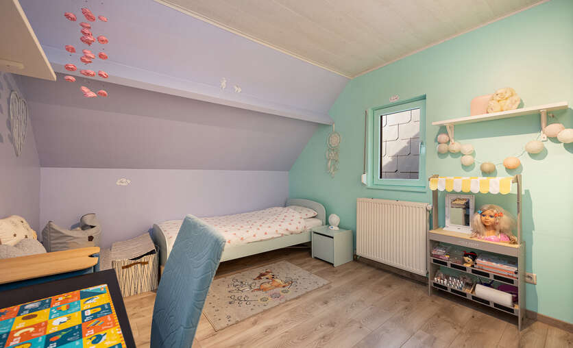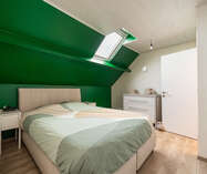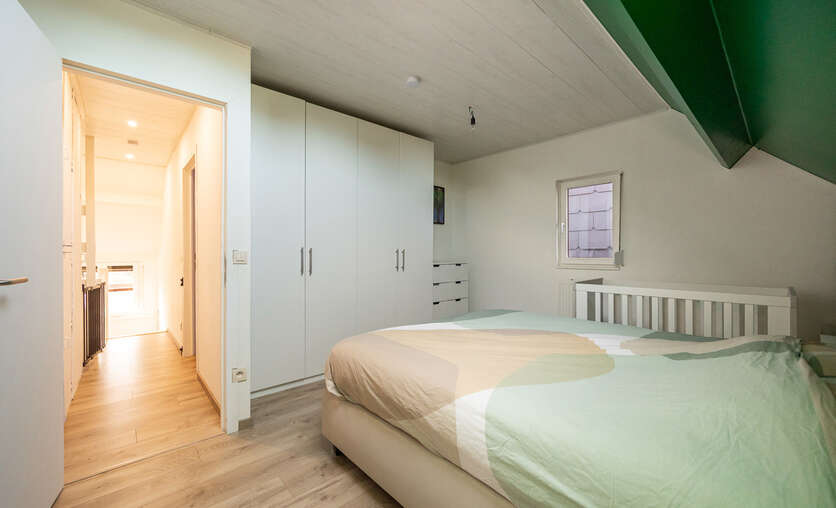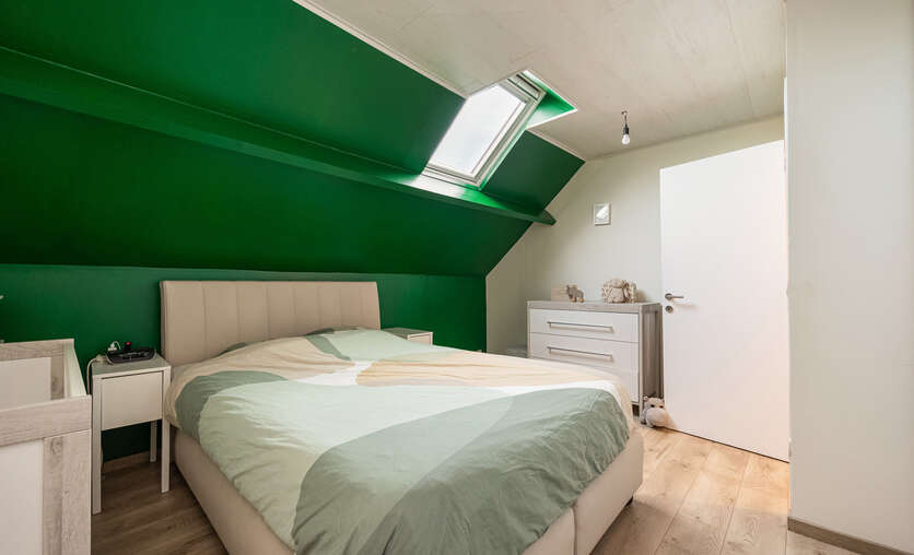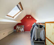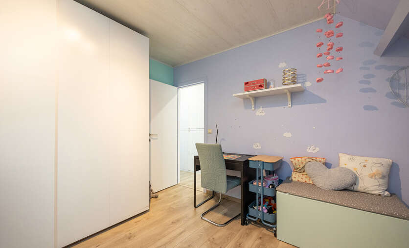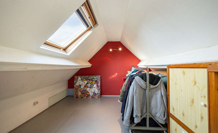 De zolderverdieping kan perfect dienen als een derde slaapkamer (14,27 m²)/ bureau/ zolderkamer op novilon met ingemaakte kasten en veluxraam.