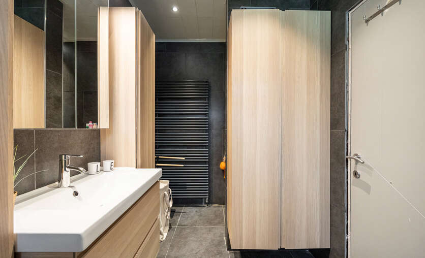 De badkamer, vernieuwd in 2015, is uitgerust met een ligbad, inloop-regendouche, lavabo in meubel, handdoekdroger en ingemaakte kasten.