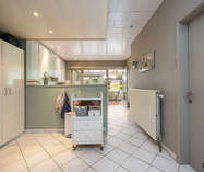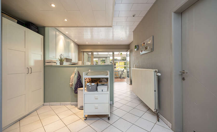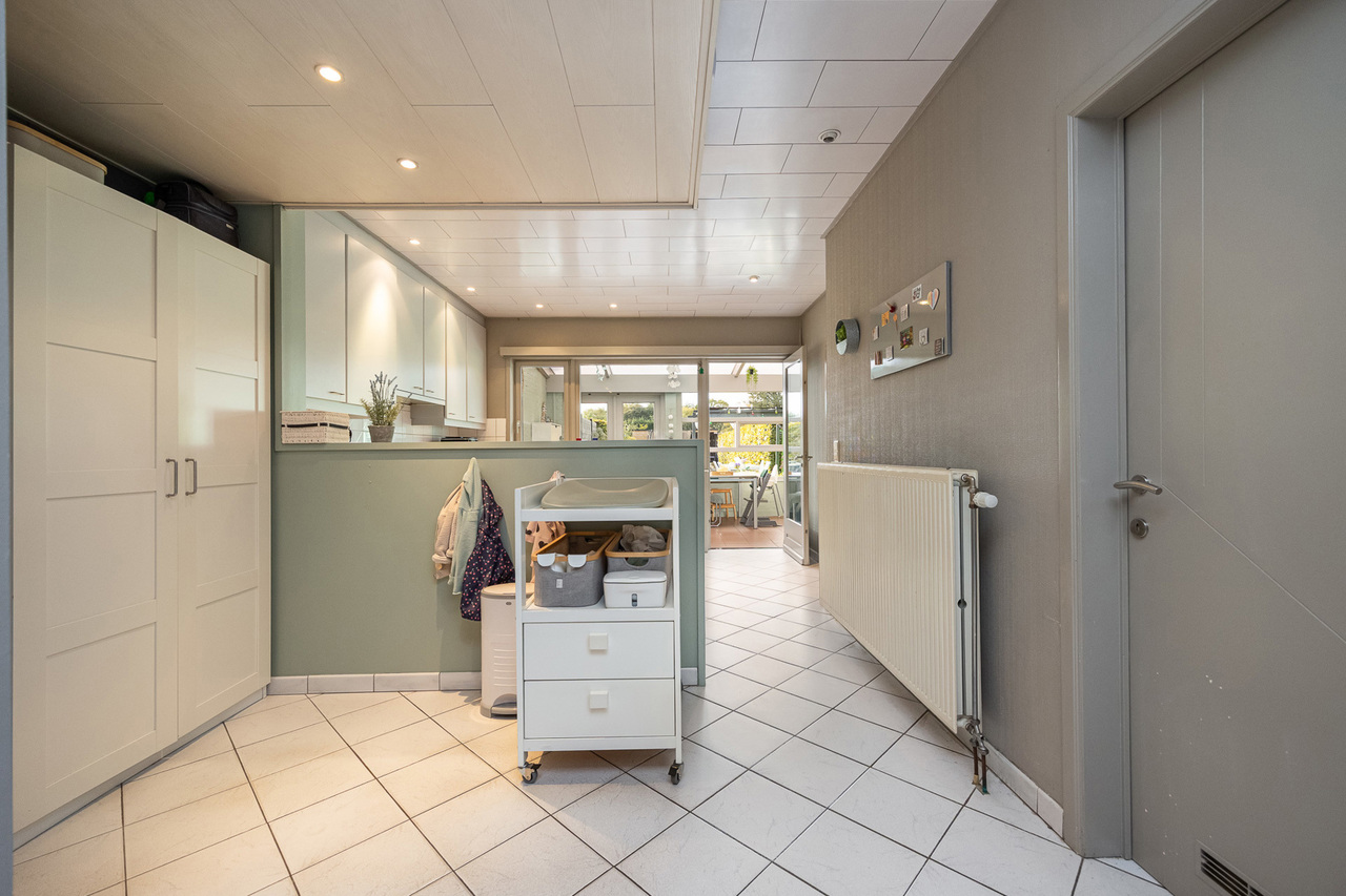 De keuken biedt toegang tot de praktische fietsgang, de kelder met CV-installatie op gas, een gastentoilet, de berging/wasplaats met aansluiting voor wasmachine / droogkast, de veranda en de badkamer.