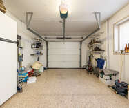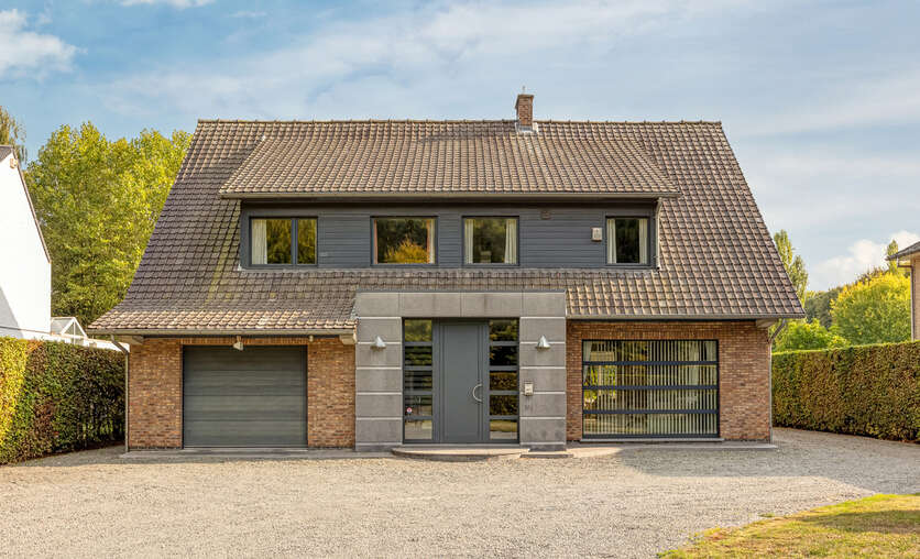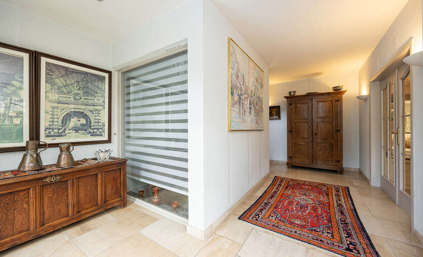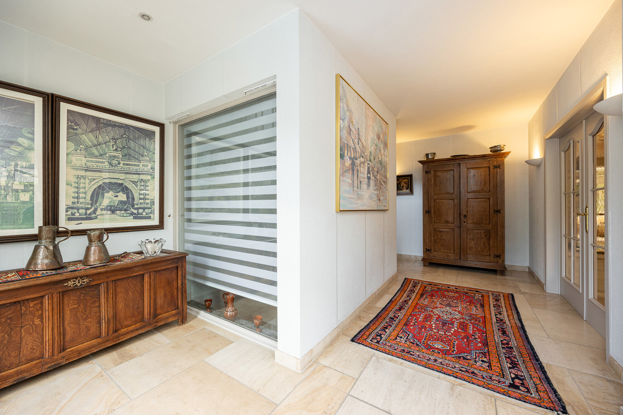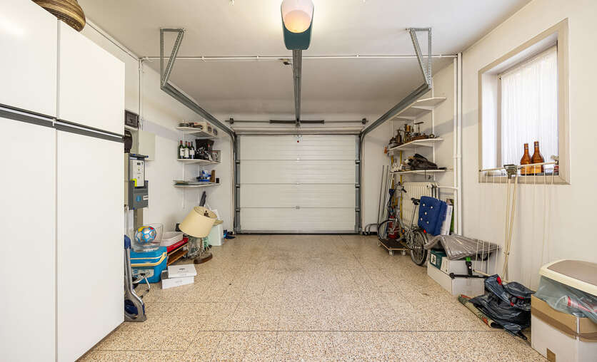 Ruime inkomhal met gastentoilet en toegang tot de woonkamer, keuken en inpandige garage (23m²) met elektrische sectionale poort, waar tevens aansluitingen voor wasmachine en droogkast aanwezig zijn, evenals een dubbele lavabo.