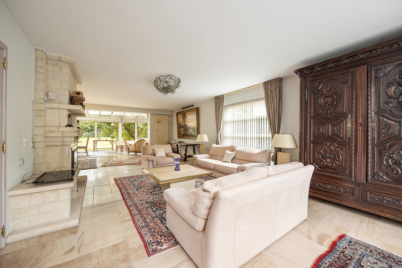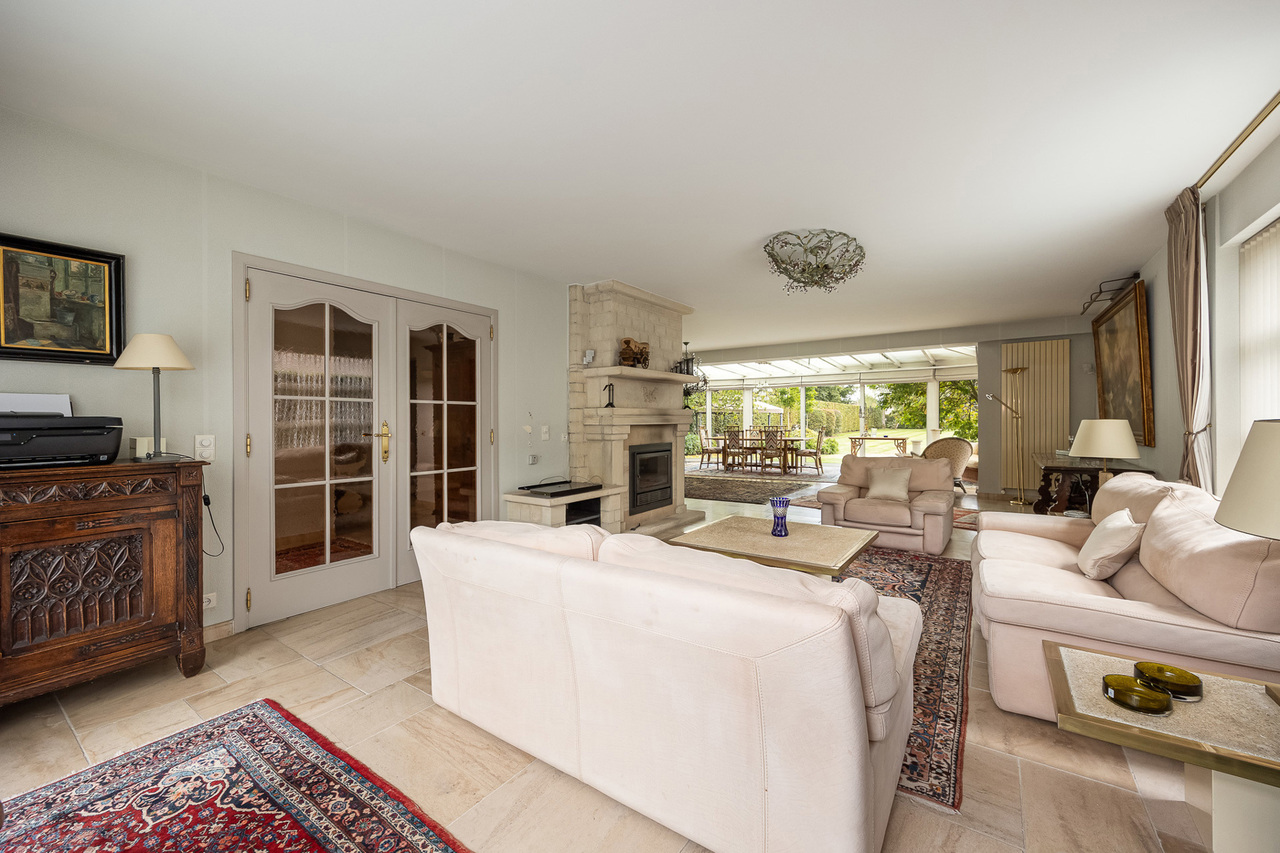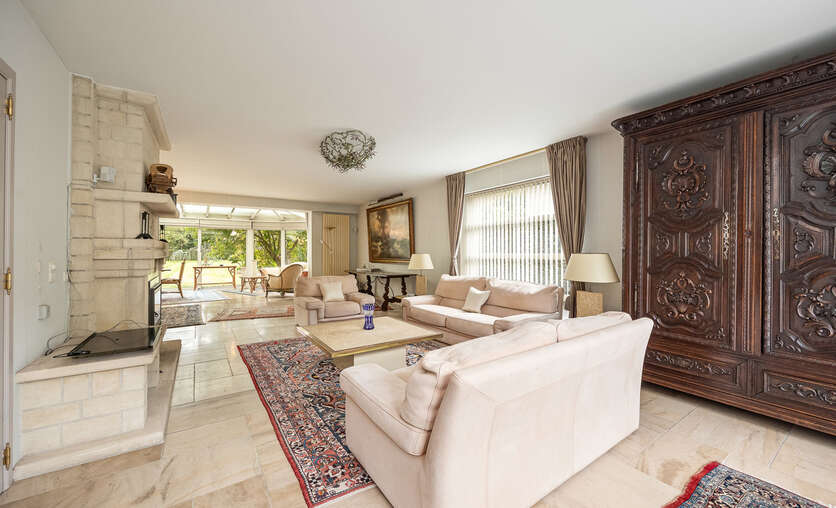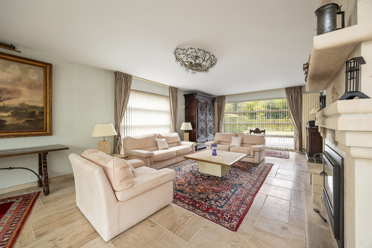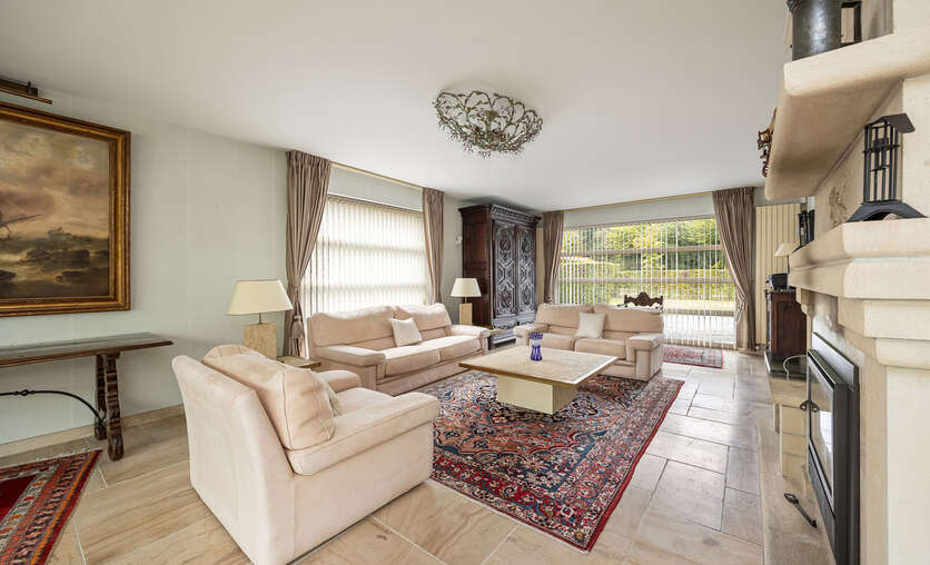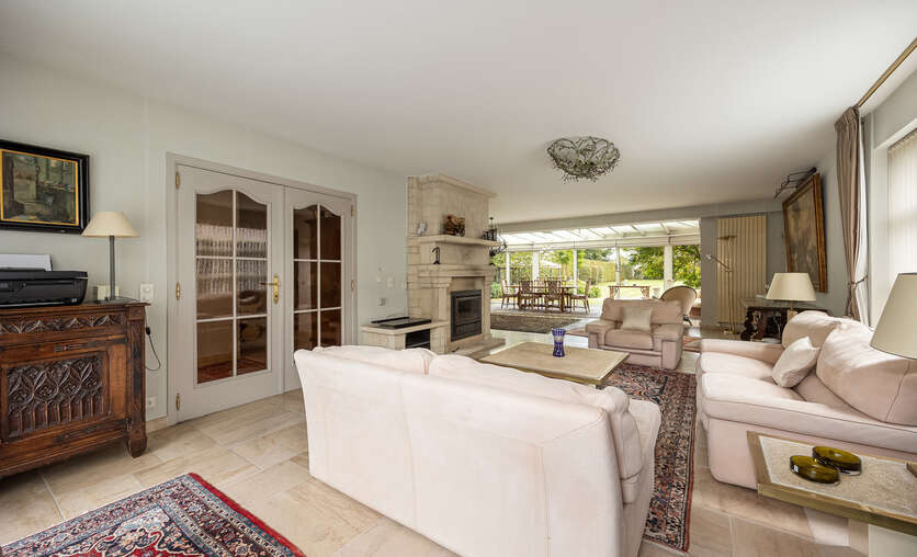 Lichtrijke woonkamer in L-vorm (55m²) voorzien van een elegante schouw in Franse natuursteen met Flam-inbouwcassette. Aansluitend een open veranda met schuifdeur tot het terras en de tuin.