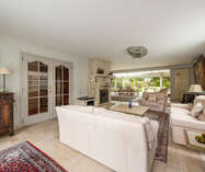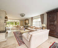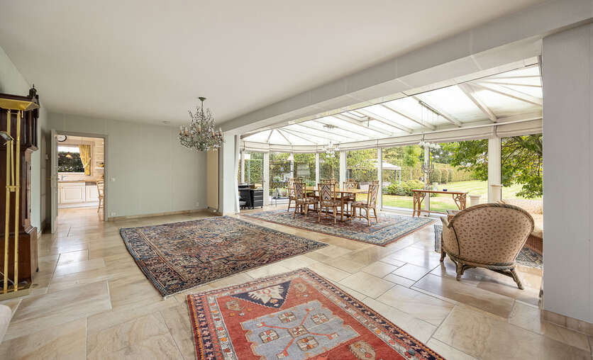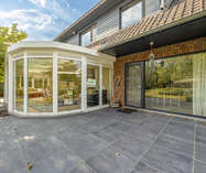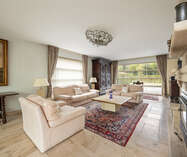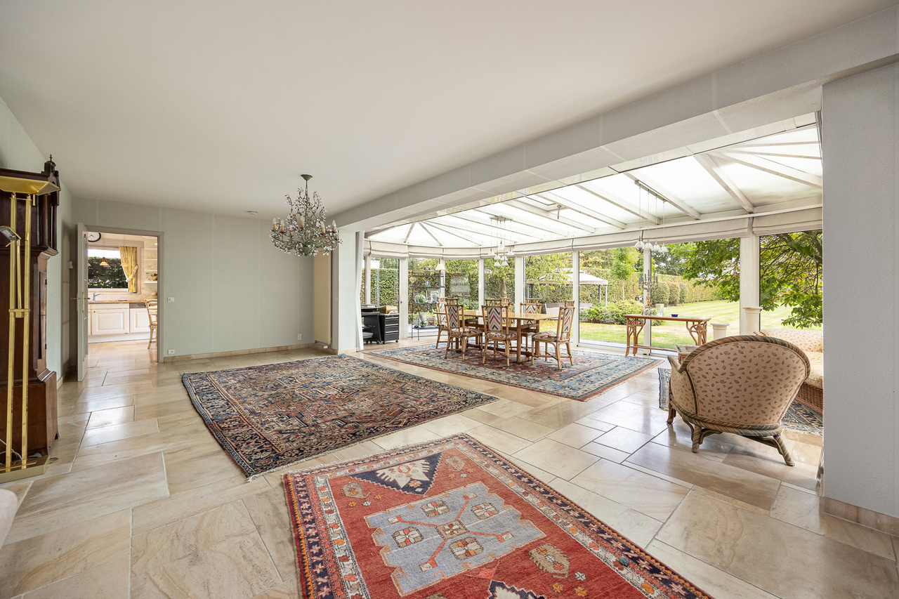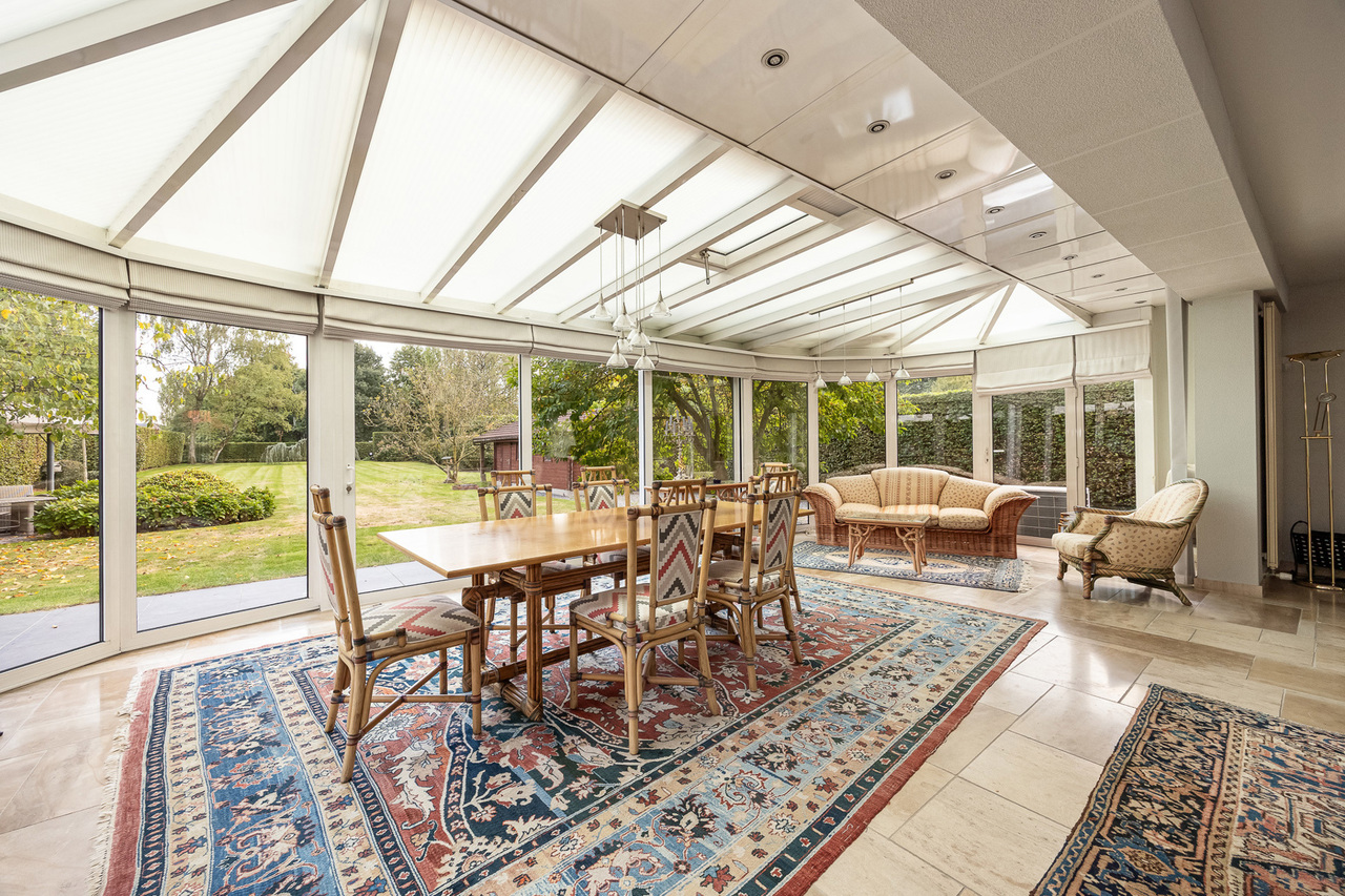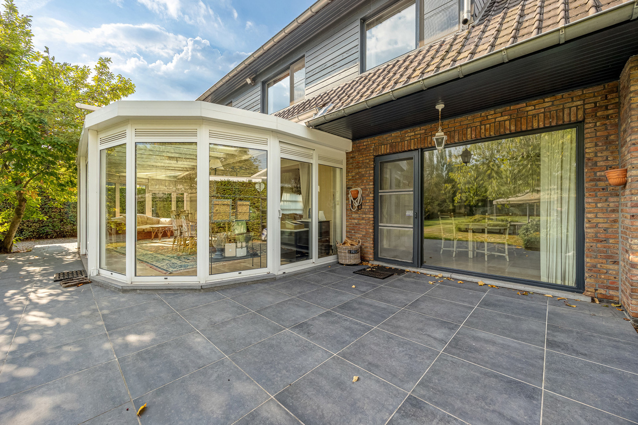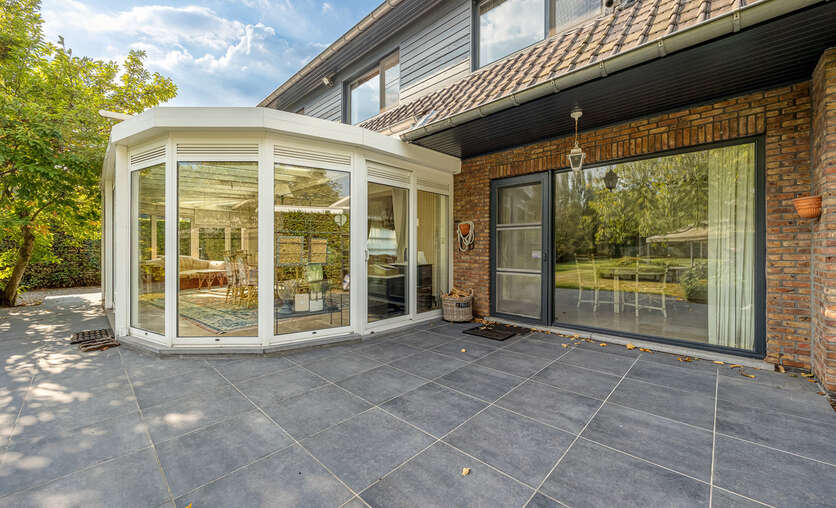 Lichtrijke woonkamer in L-vorm (55m²) voorzien van een elegante schouw in Franse natuursteen met Flam-inbouwcassette. Aansluitend een open veranda met schuifdeur tot het terras en de tuin.
