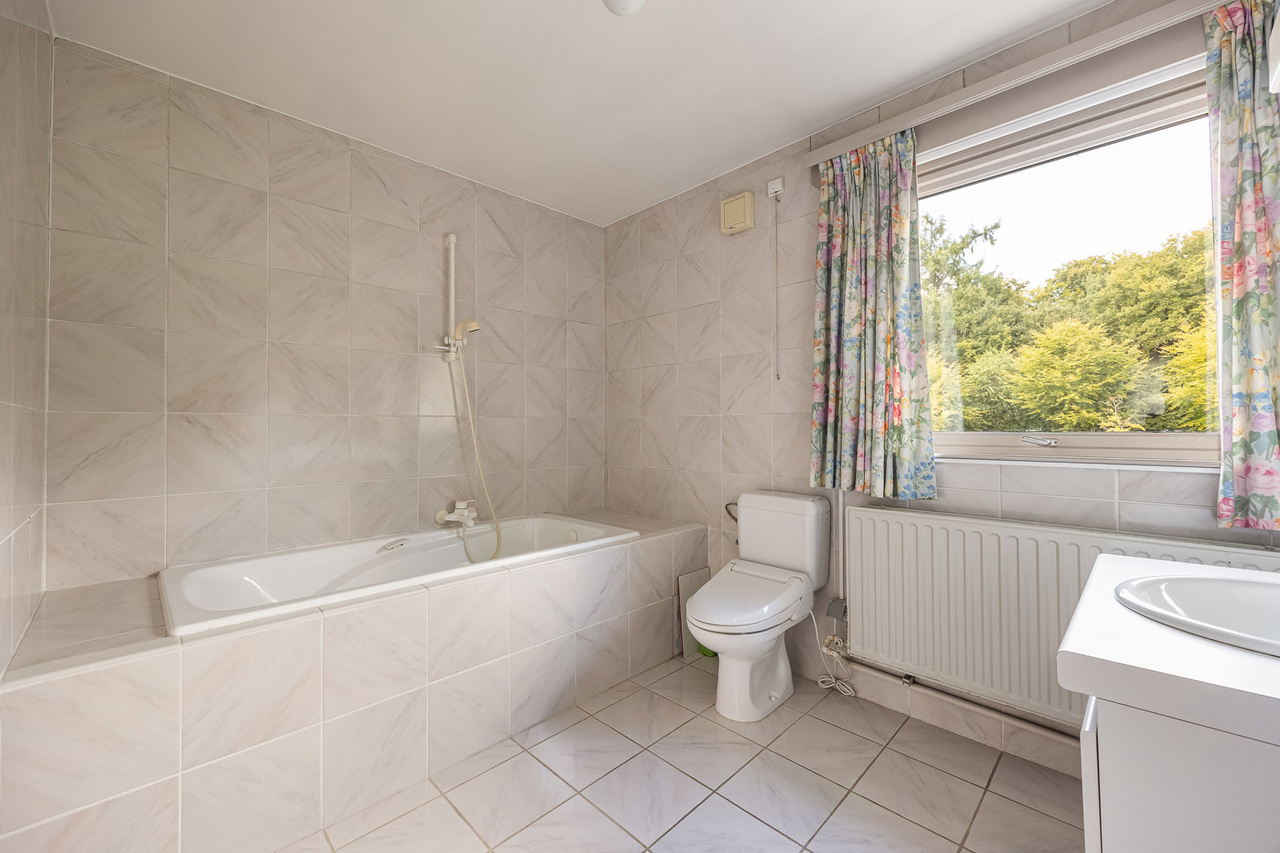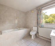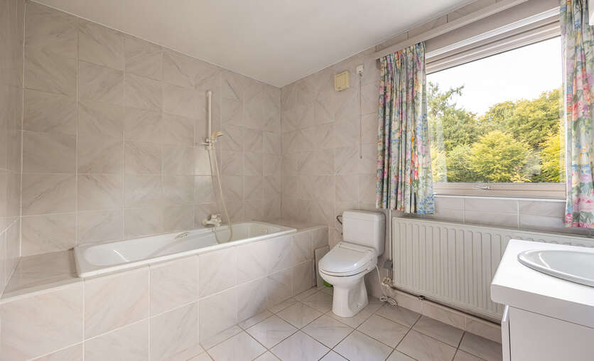 De tweede badkamer is uitgerust met een ligbad met geïntegreerde douche, een lavabo in meubel en een toilet.