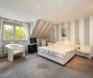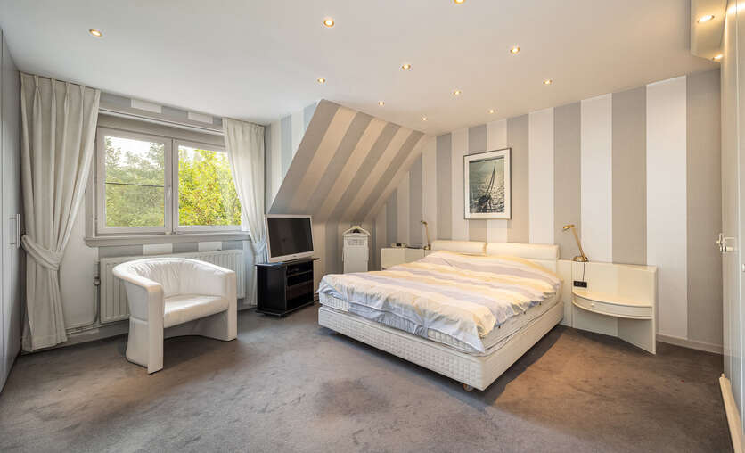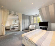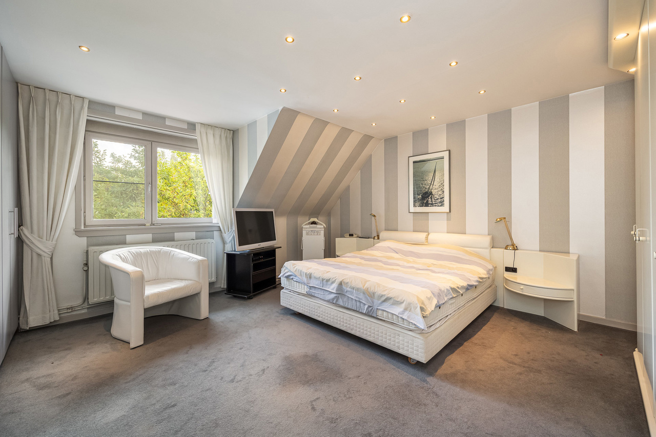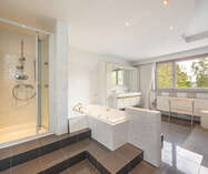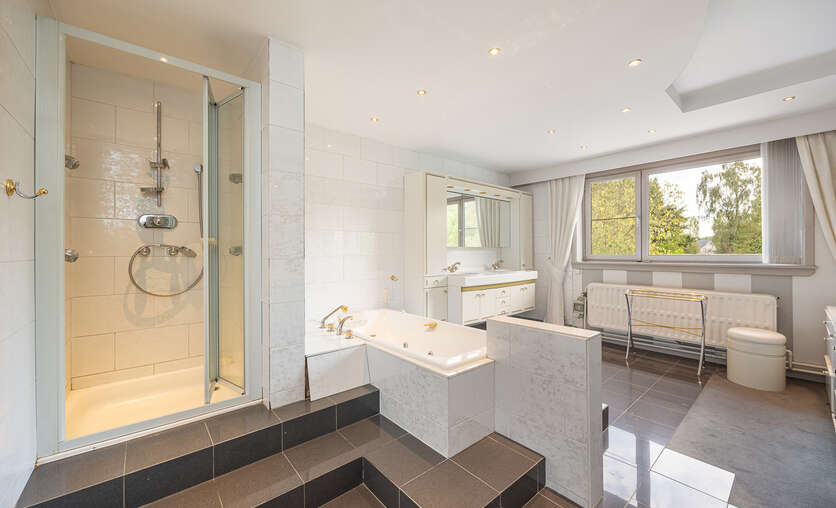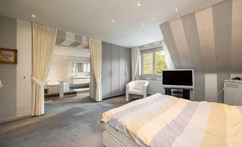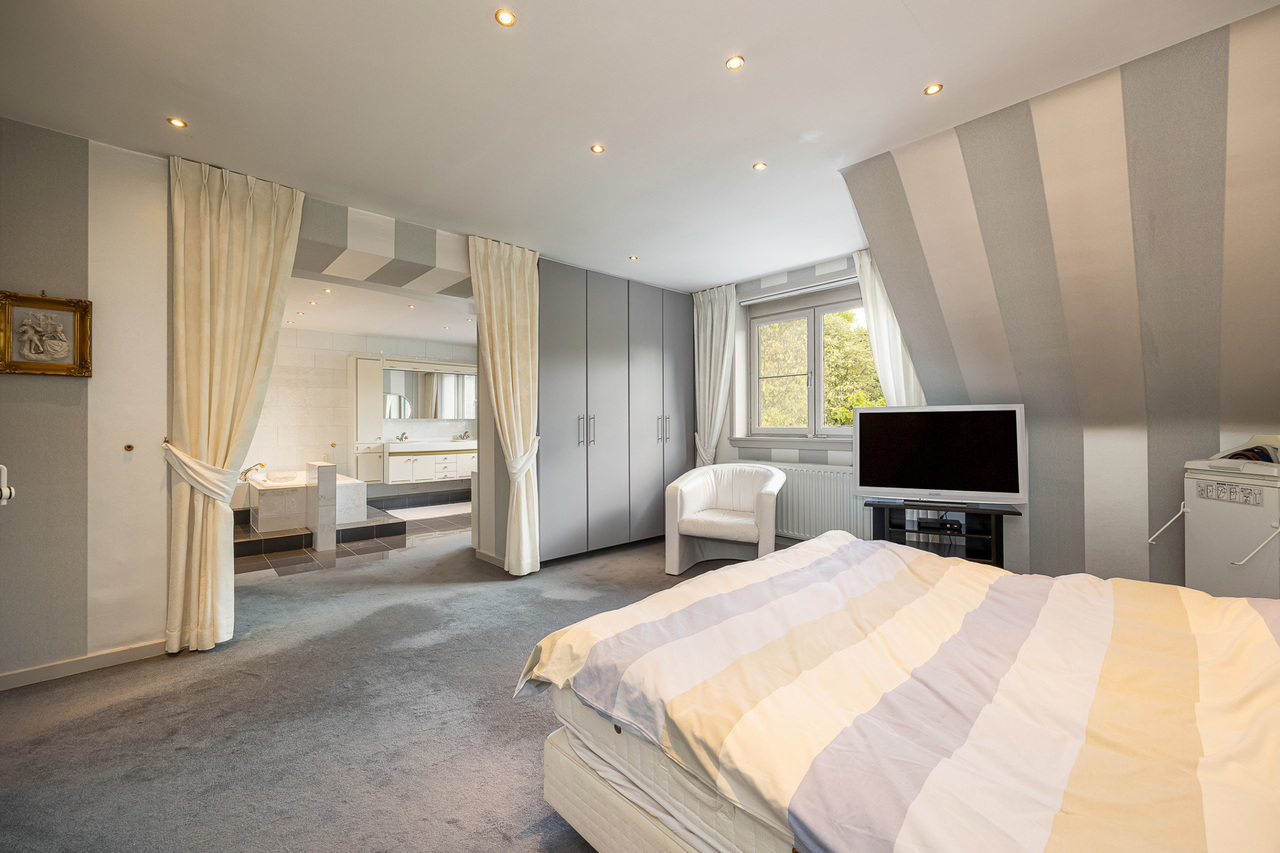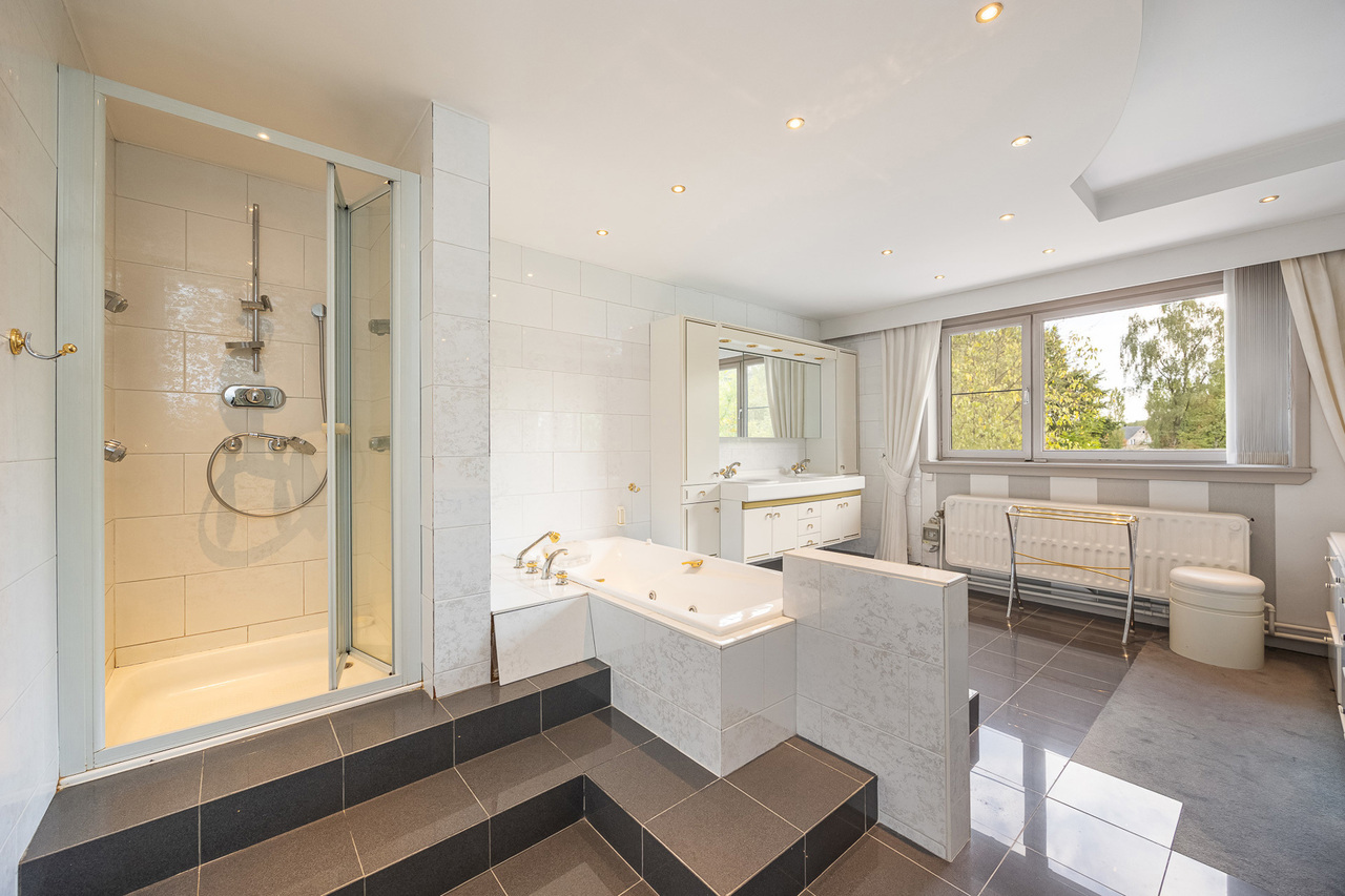 De masterbedroom is voorzien van een ensuite badkamer met ligbad, douchecabine en dubbele lavabo in meubel.