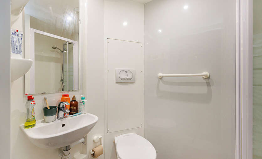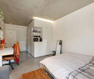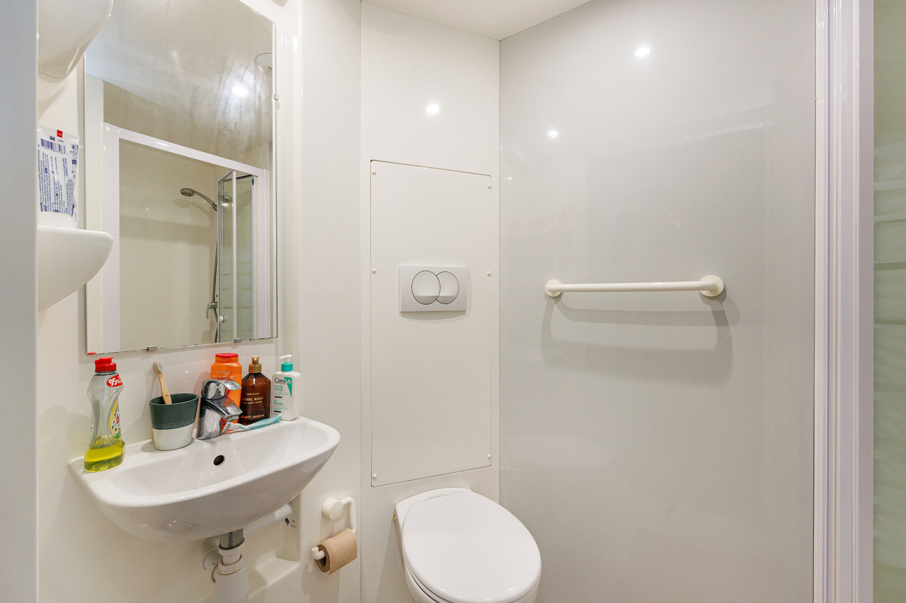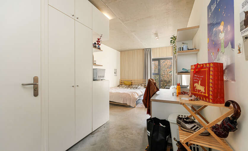 De studentenkamer beschikt over een private badkamer met lavabo, douche en toilet. is volledig ingericht met een bed, bureau en praktische ingemaakte kasten met koelkast.