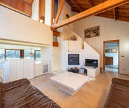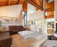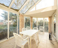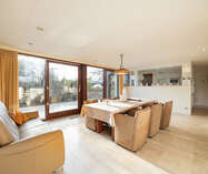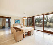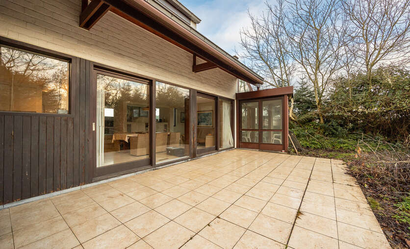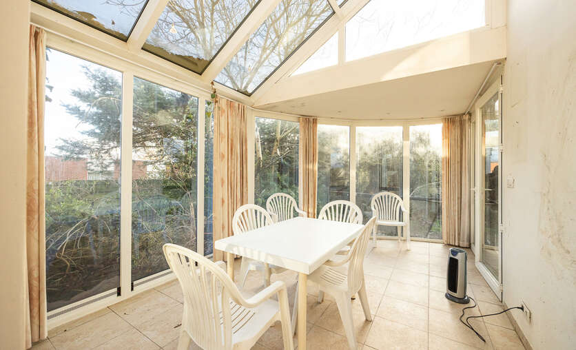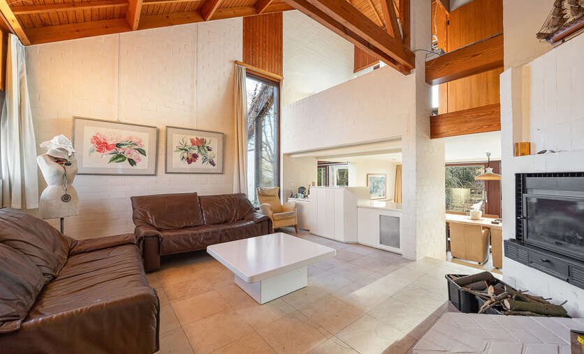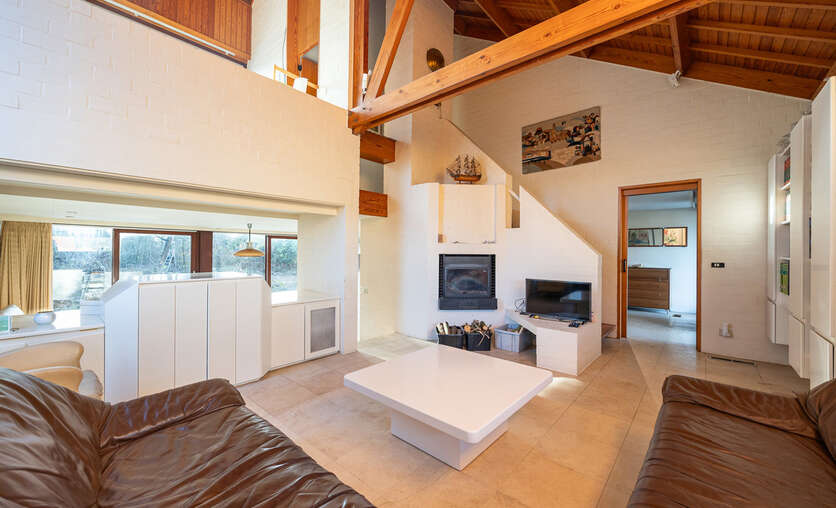 De ruime woonkamer (36m²) op bourgondische natuursteen, geniet van veel lichtinval en biedt via twee schuifdeuren toegang tot het terras. Vanuit de veranda bereik je opnieuw het terras en de tuin. De verhoogde zithoek (22m²) met inbouwcassette op hout en vide zorgt voor extra gezelligheid.