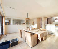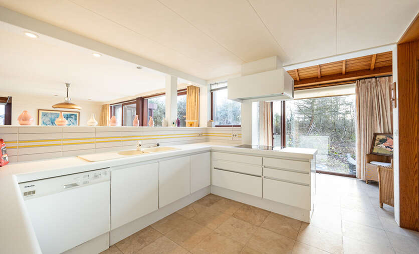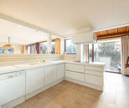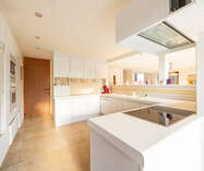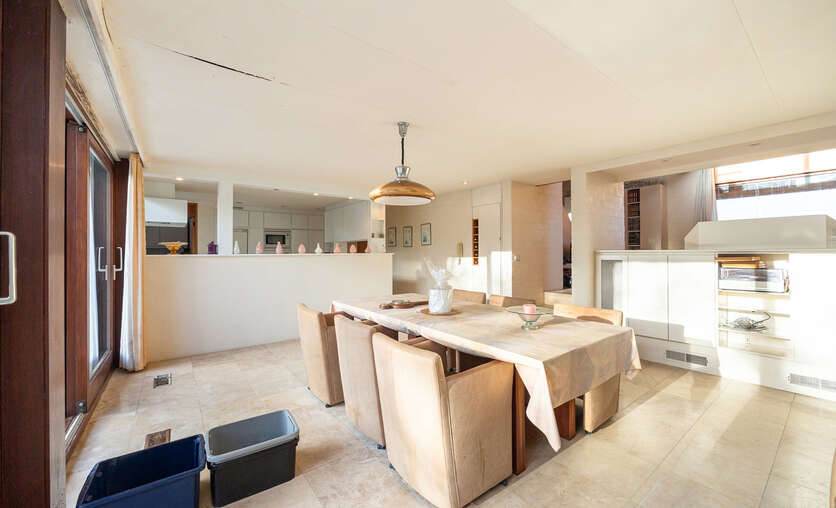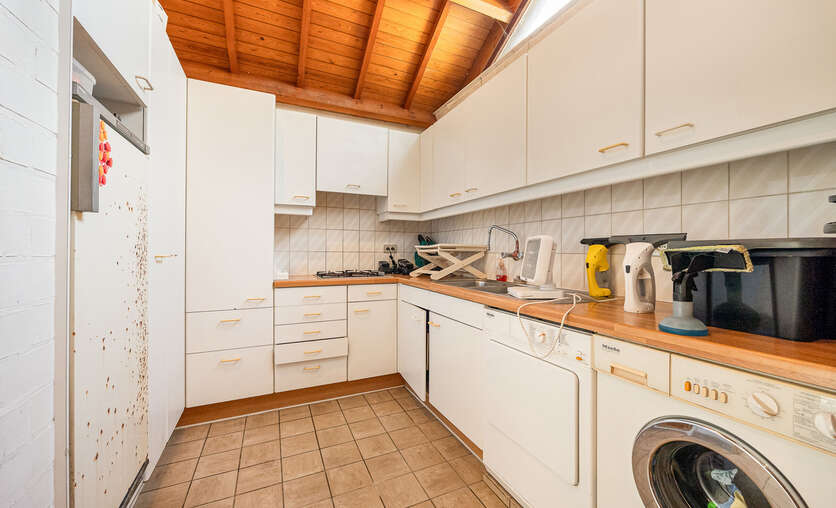 De ingerichte keuken beschikt over een praktische ontbijthoek en is uitgerust met een dubbele spoelbak, vaatwasser, vitrokeramische kookplaat, dampkap, koelkast en oven. Ook hier is er een rechtstreekse toegang tot het terras.