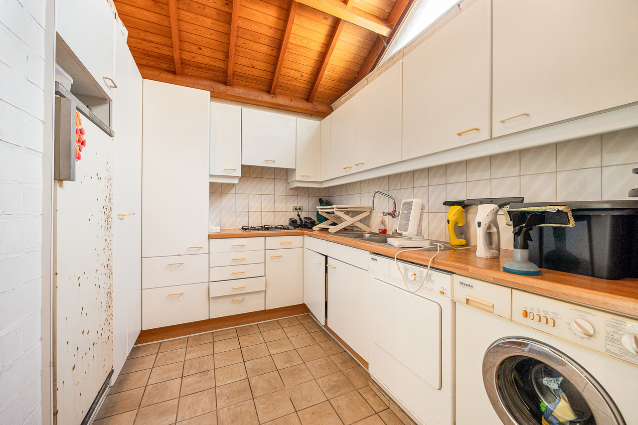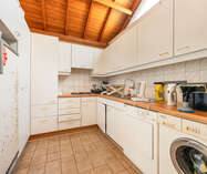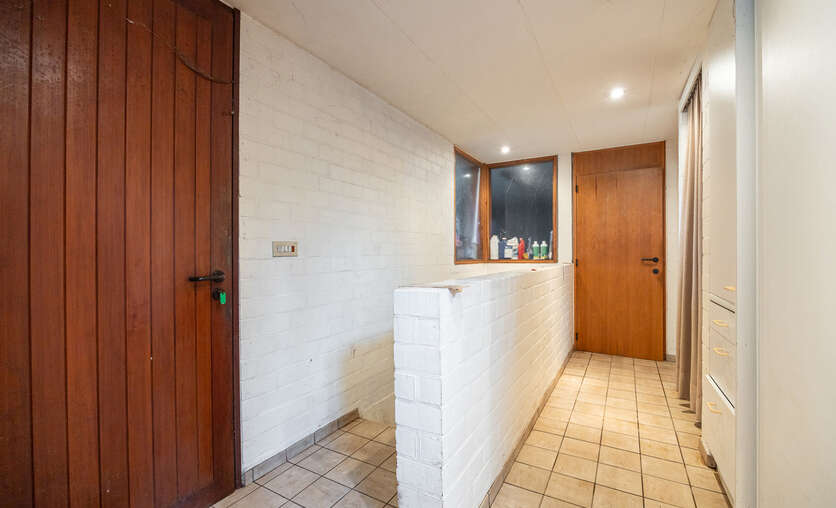 Aansluitend bevindt zich de wasplaats/bijkeuken met ingemaakte kasten, dubbele lavabo, gasfornuis, dampkap en aansluitingen voor wasmachine en droogkast. Vanuit de hal met ingemaakte kasten heb je toegang tot de kelder (142m²). De woning is volledig onderkelderd, wat zorgt voor extra opslagruimte.