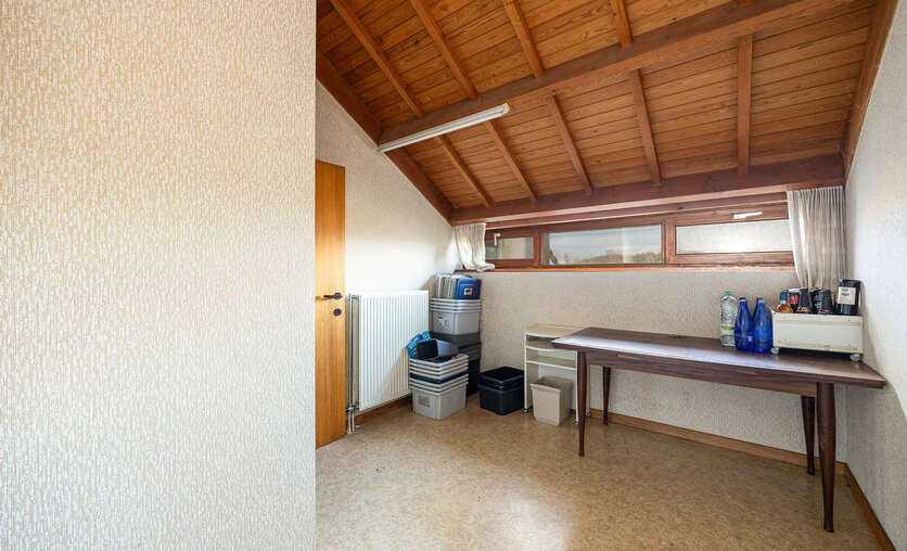 Verder beschikt het gelijkvloers over een ruime garage (39m²) met twee manuele kantelpoorten.